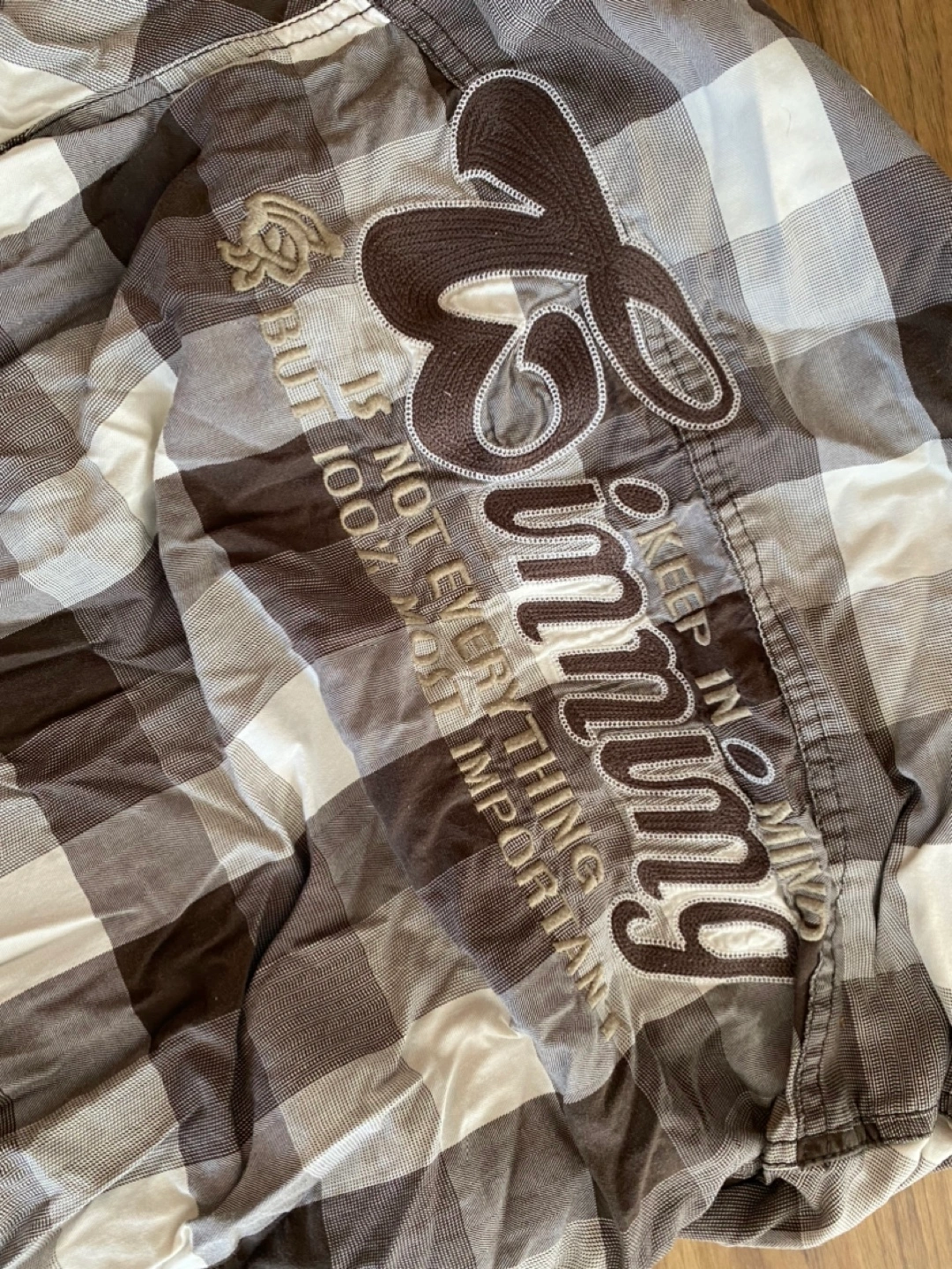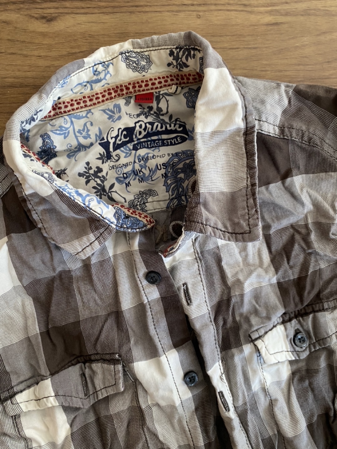Selling a Glo Brand Vintage Style shirt with a cool plaid pattern! It's in good condition and has a unique design. The shirt features a button-up style and two front pockets. The back has some embroidered details.