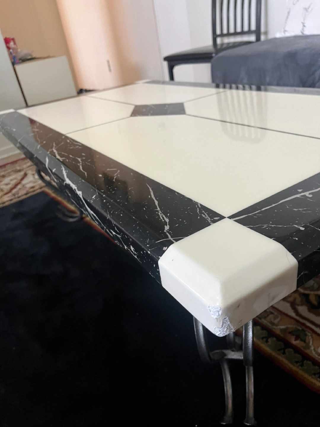 I'm selling a coffee table with a black and white design. It has a unique marble-like pattern on the top and a sturdy metal base. It's a great piece to add a touch of modern elegance to your living room. There are some signs of wear on the corners, as shown in the photos, but it's still in good condition and ready for a new home!