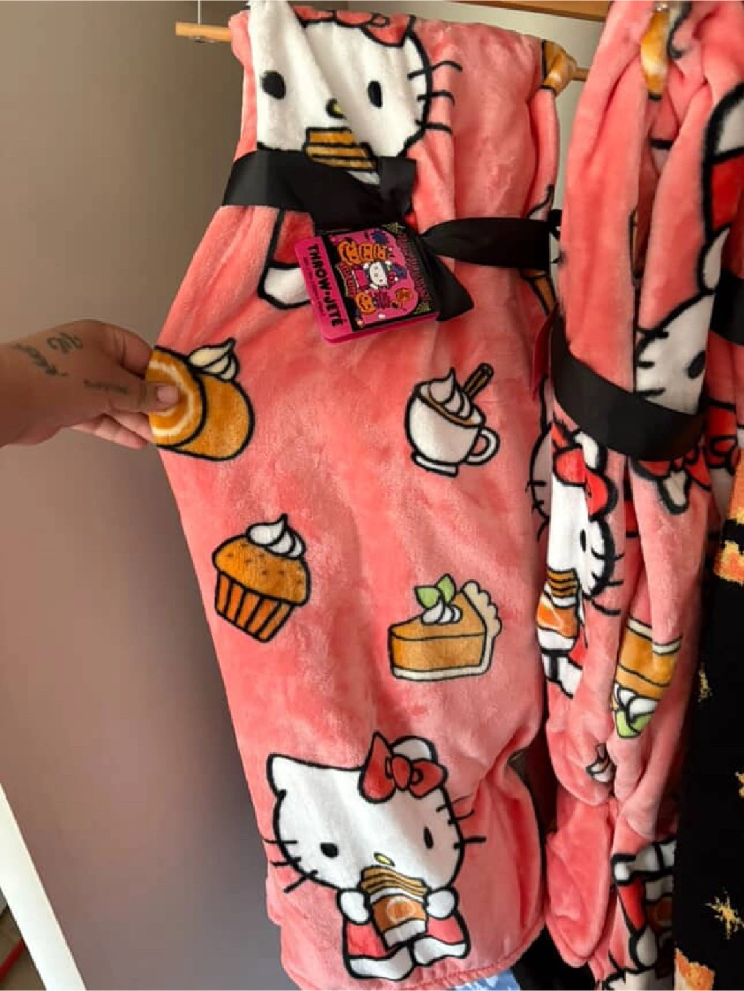 I have a brand new Hello Kitty throw blanket for sale! It's a super cute, soft blanket featuring Hello Kitty and some yummy-looking treats. It still has the tags on it and is ready to keep you cozy!