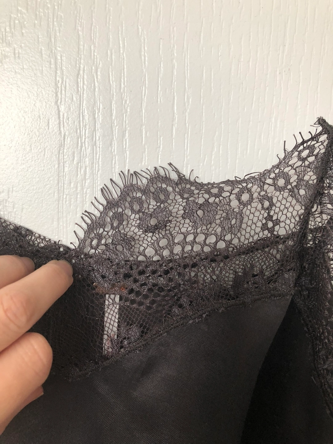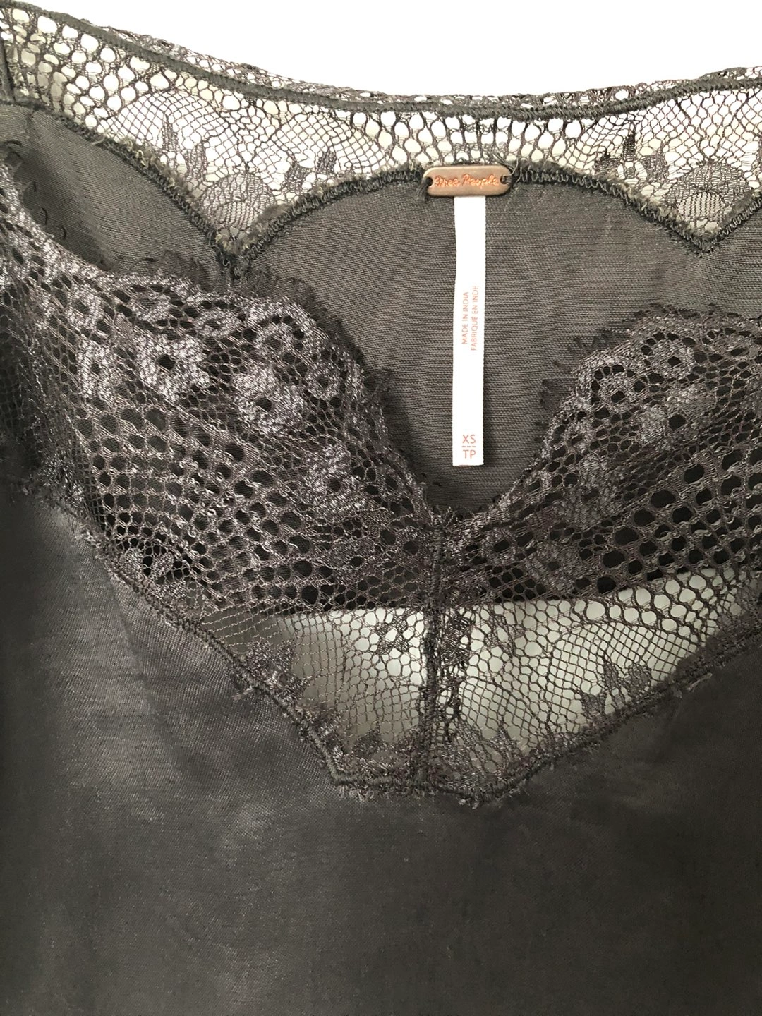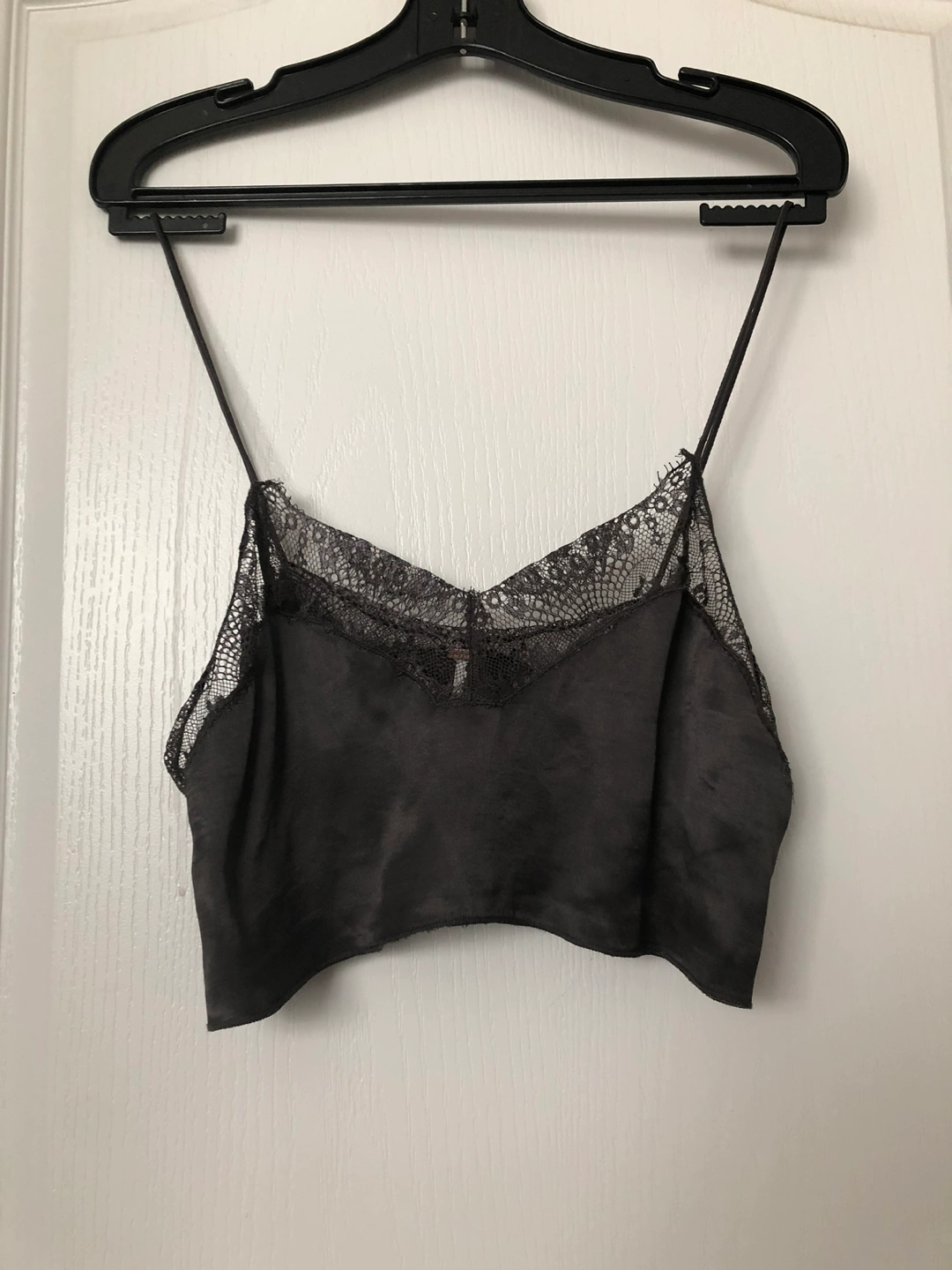 Free People. Slate grey, great condition, super pretty, cropped lace cami. Xs but I’d say it’d fit small as well.