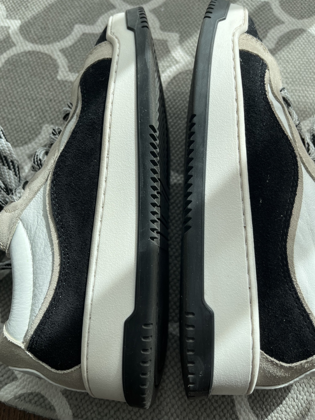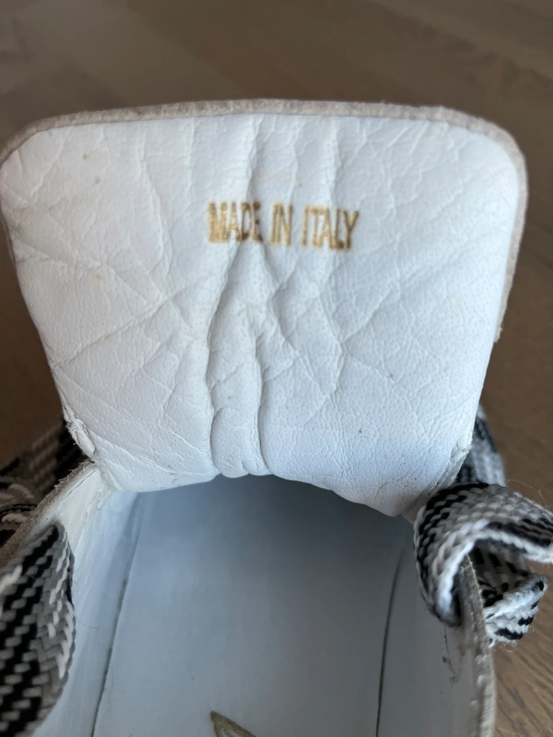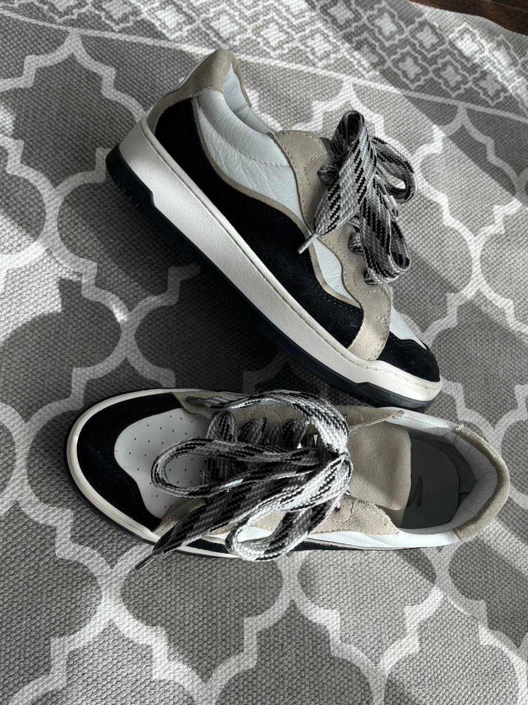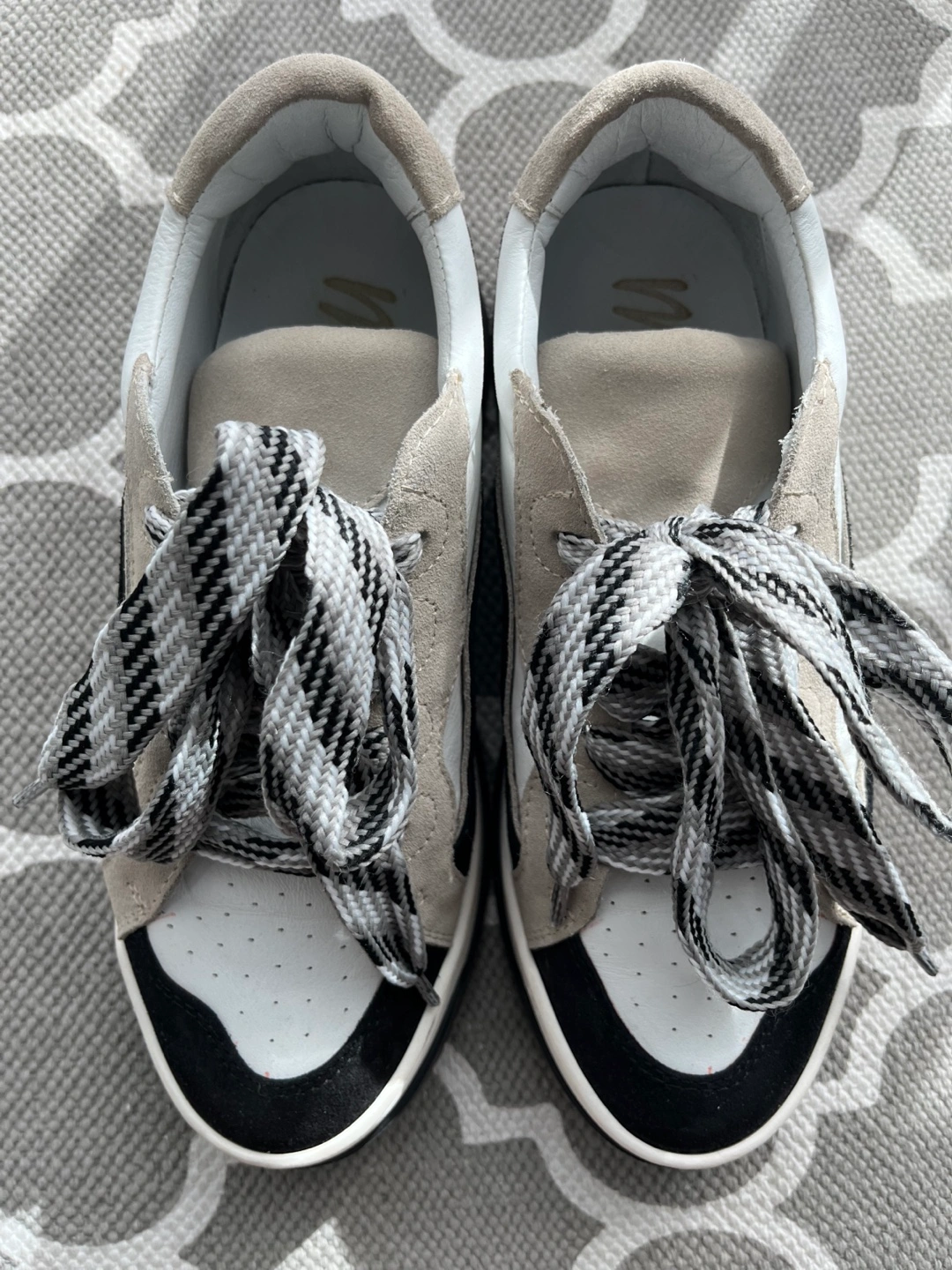 Selling a pair of Mimosa Couture sneakers in size 38. Made in Italy. These stylish sneakers feature a unique black, white, and beige colour scheme with decorative laces and are very comfortable.