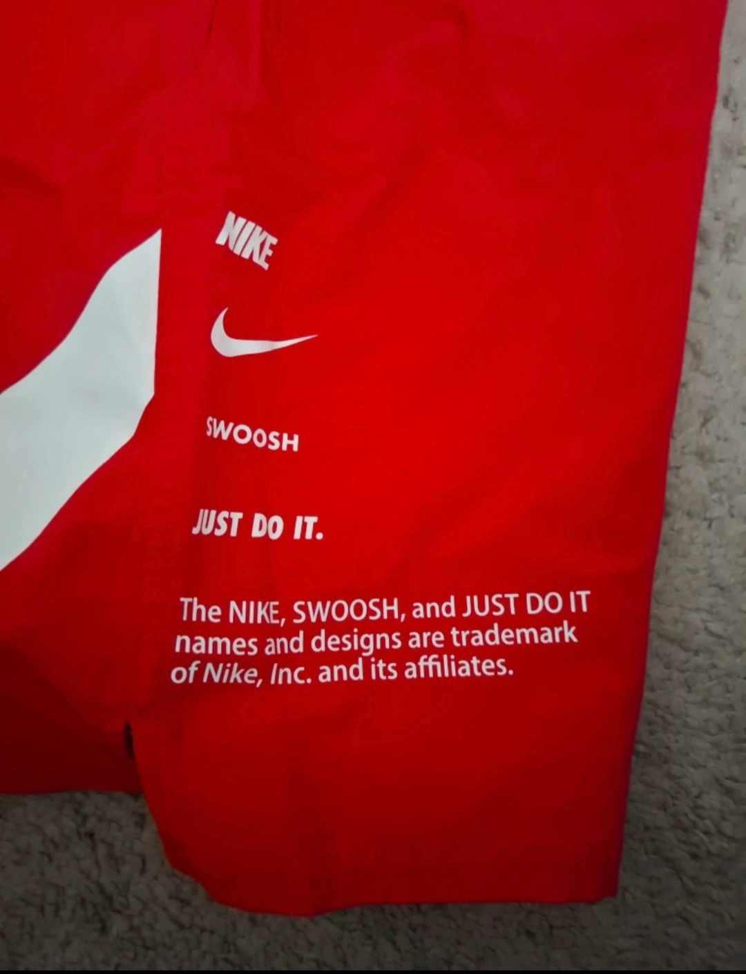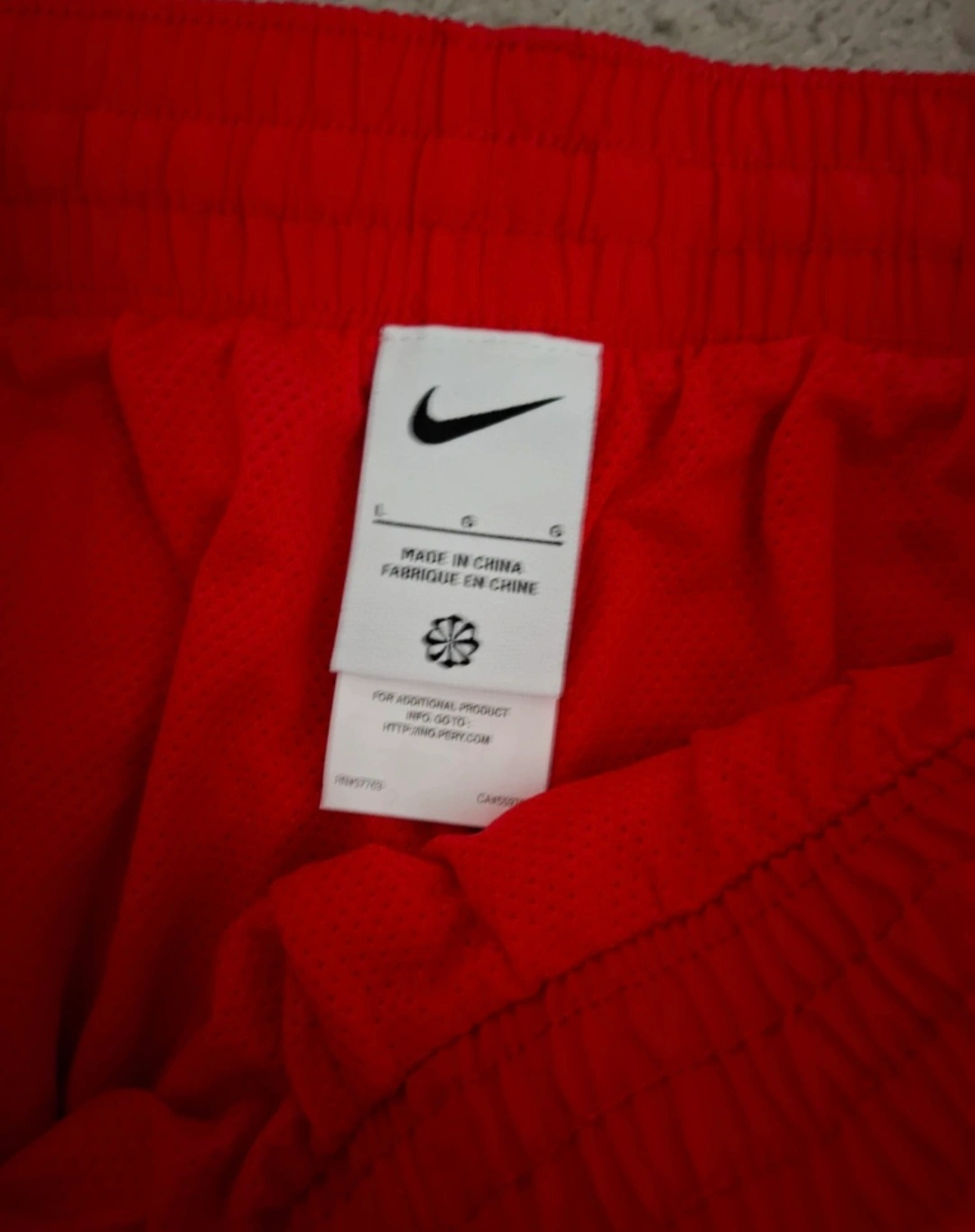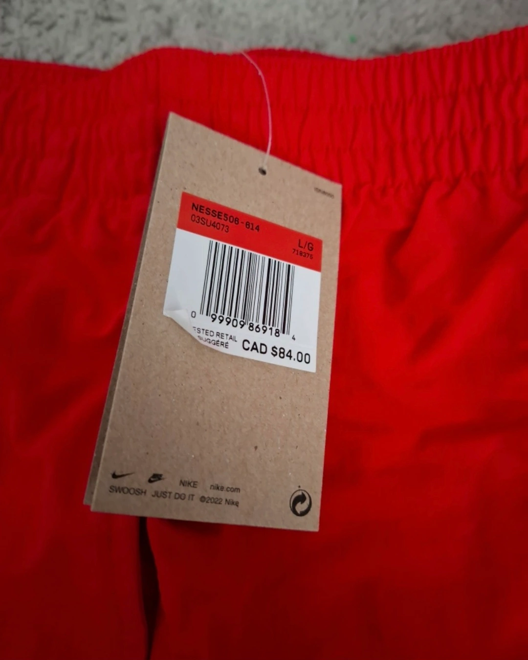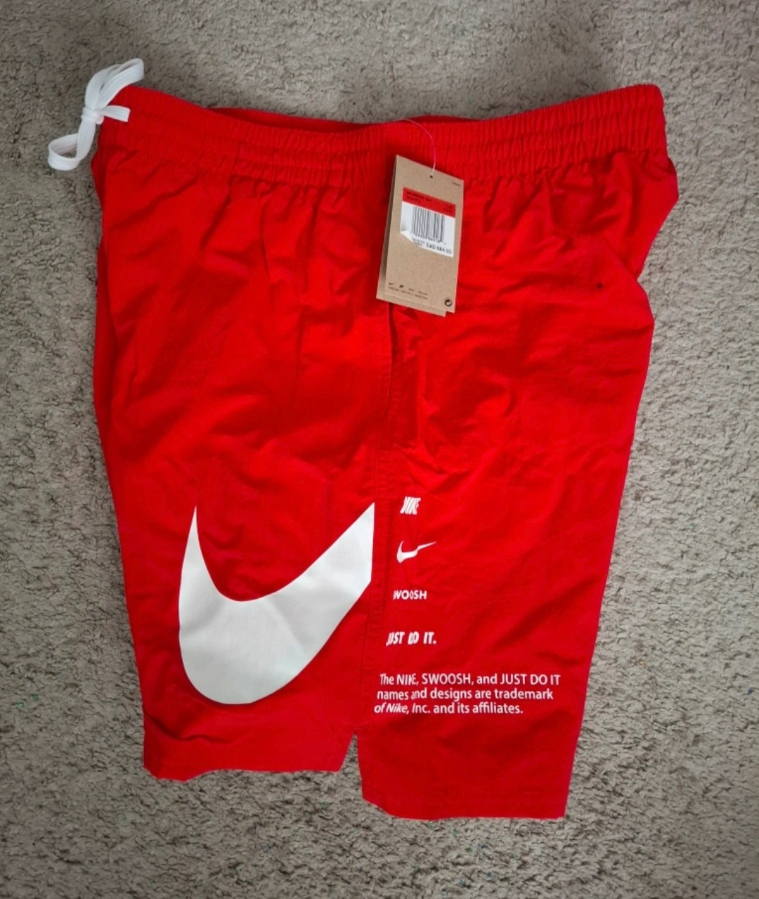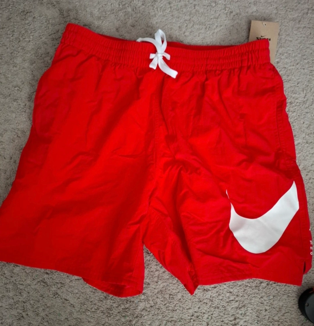 Get ready to hit the gym or the track with these vibrant red Nike woven training shorts! They're a size large and feature the iconic Nike swoosh. The tag shows they originally retailed for CAD $84.00