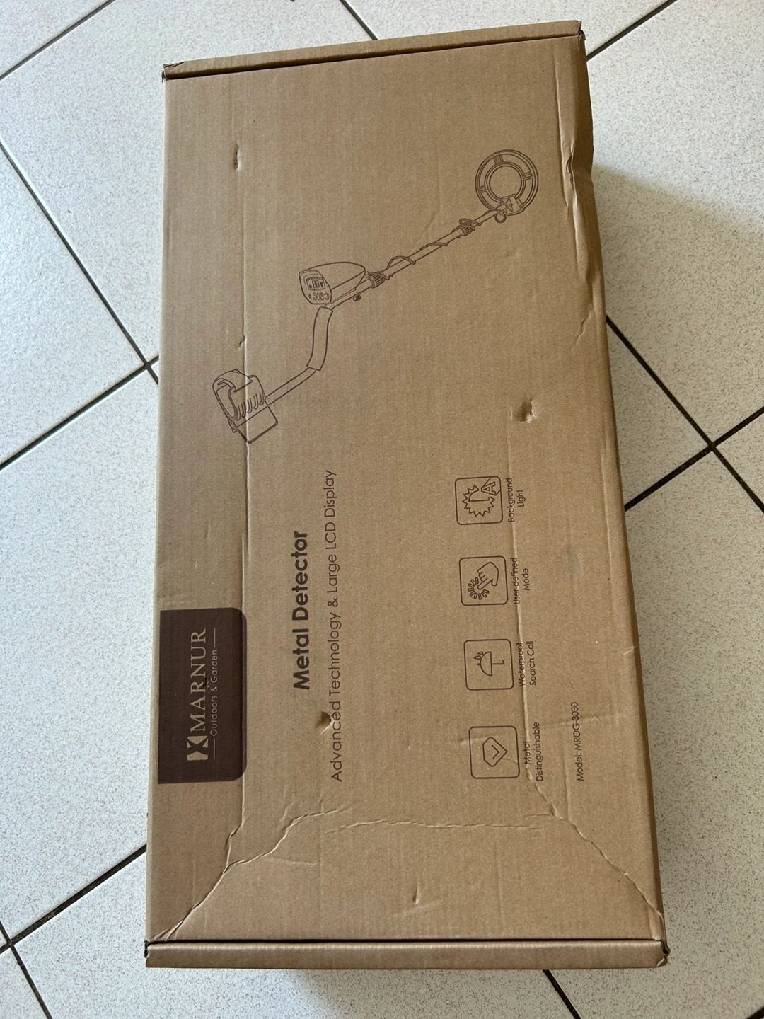 Selling a brand new MARNUR Metal Detector! It features advanced technology and a large LCD display. The box includes details about the detector's capabilities, such as its waterproof search coil and adjustable stem. Perfect for outdoor adventures and treasure hunting! Brand new factory sealed