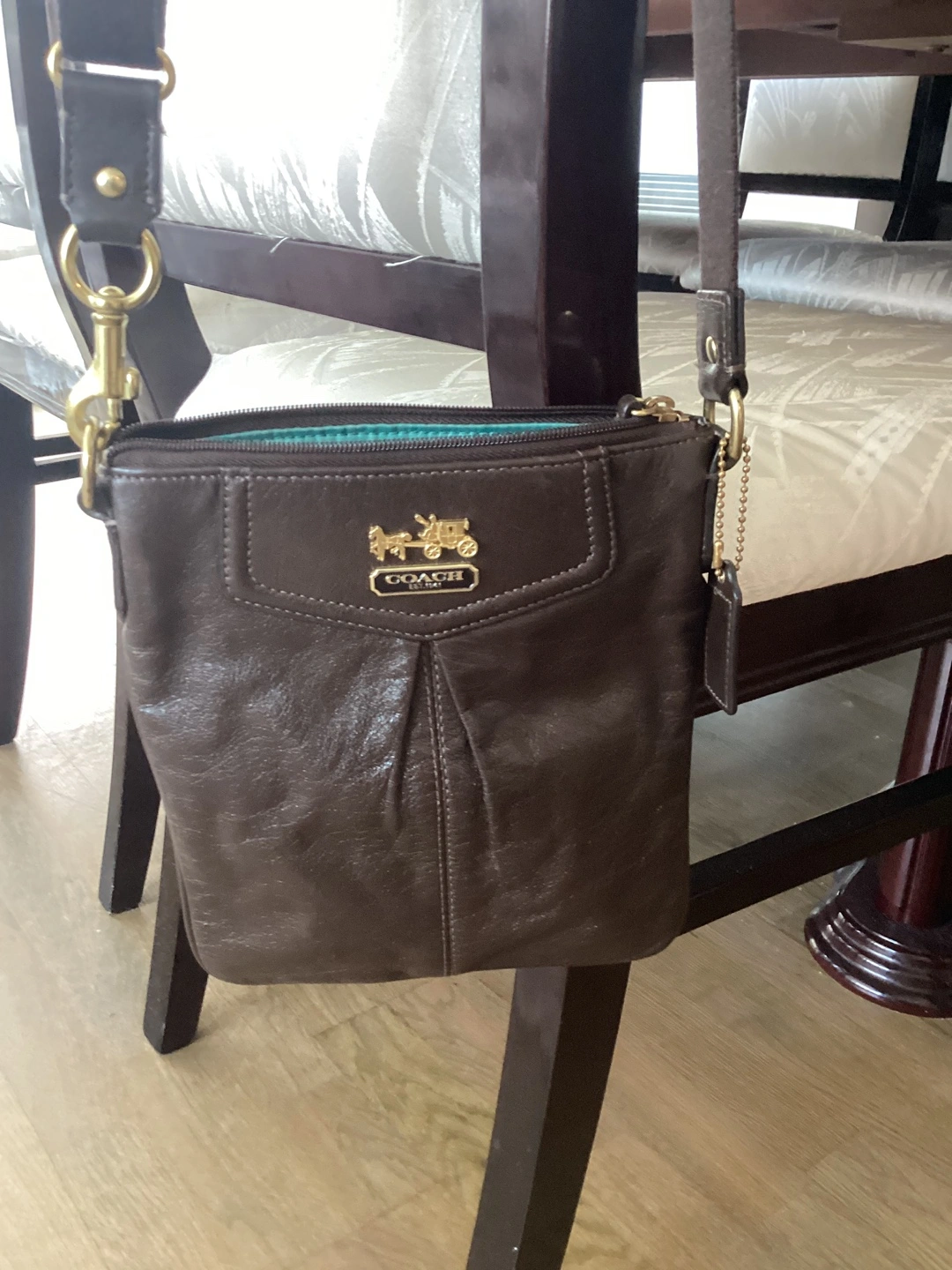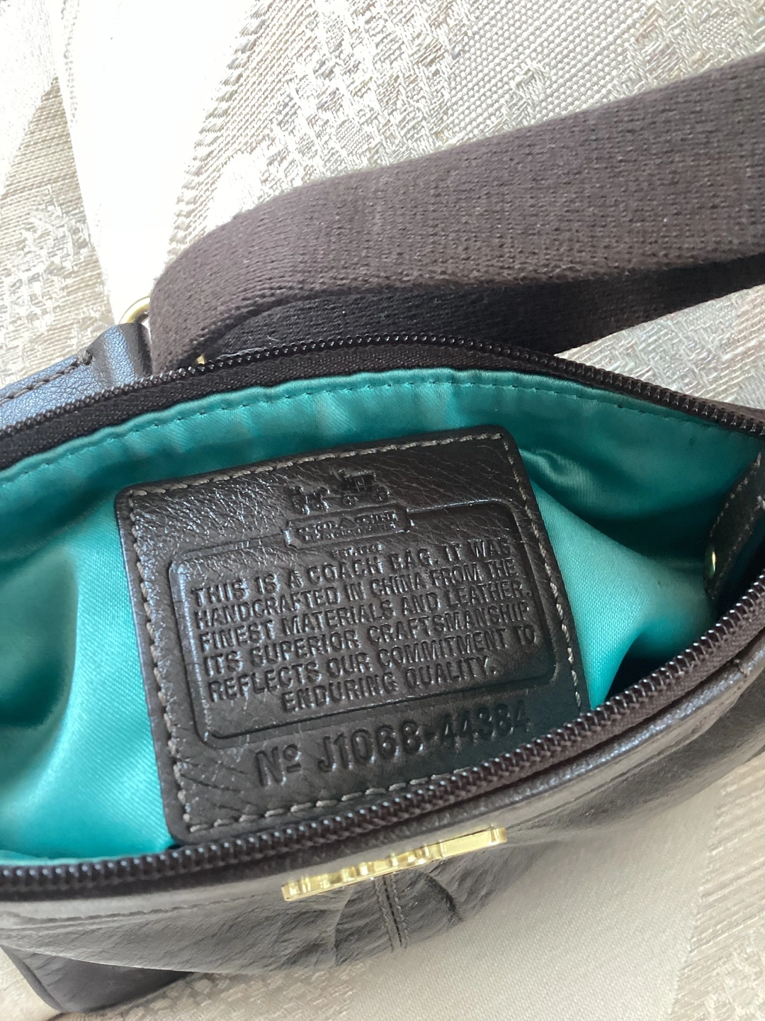 A stylish Coach crossbody bag in a lovely brown leather! The interior is a bright turquoise colour. The model number is J1068-44384