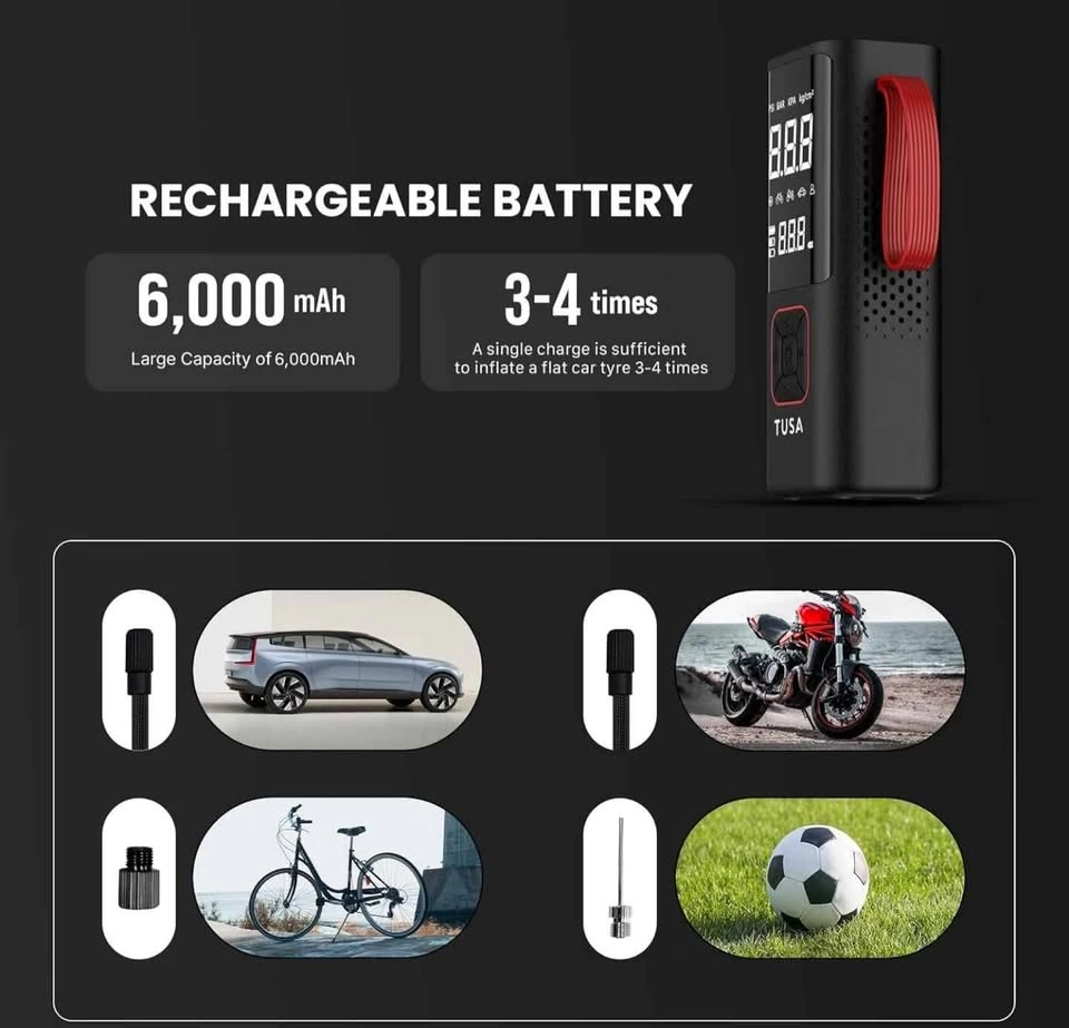 It works for Sedans, SUVs, Large pickup trucks, motorbikes, cycles, escooters, balls etc. Comes with all the cables and additional attachments.