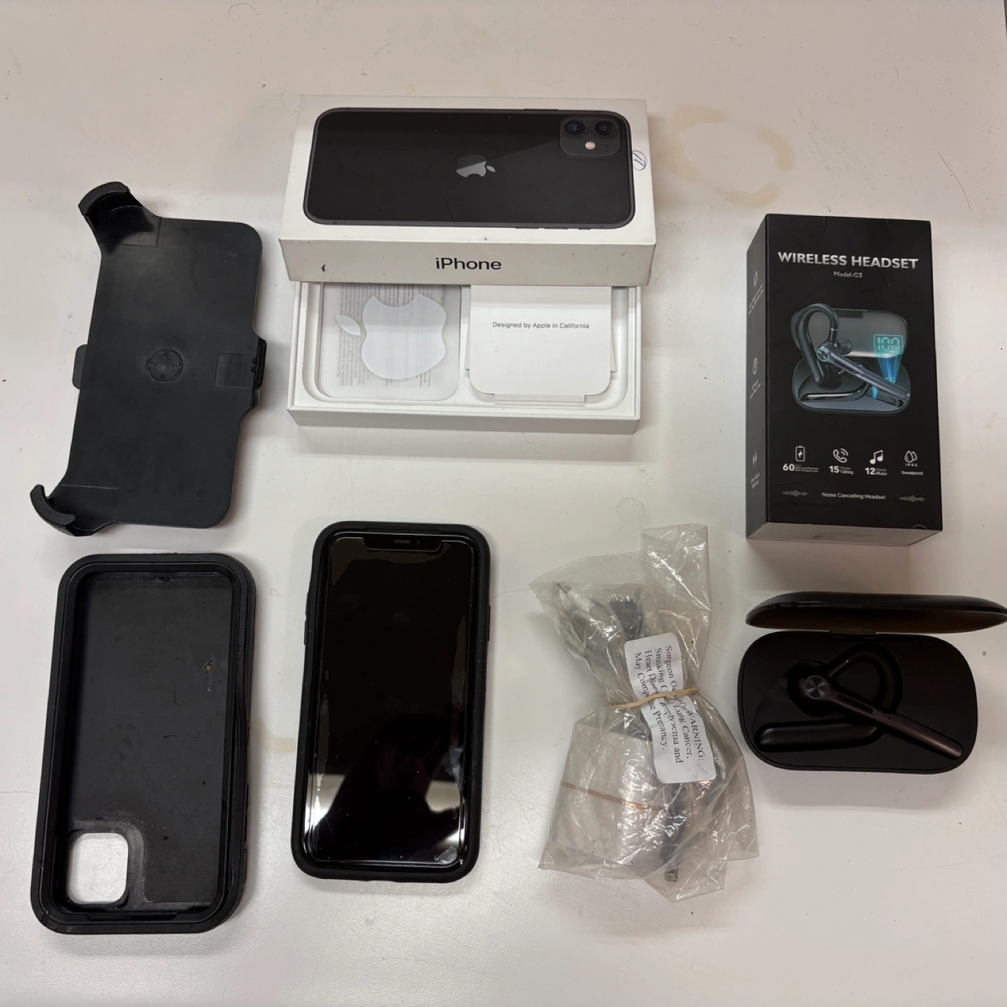 Selling an Apple iPhone 11 , looks like it's in great condition! Also included is a Wireless Headset Model G3. Comes with noise cancelling headset. Great for talking on the go - also comes with excellent damage protection casing kit!!'