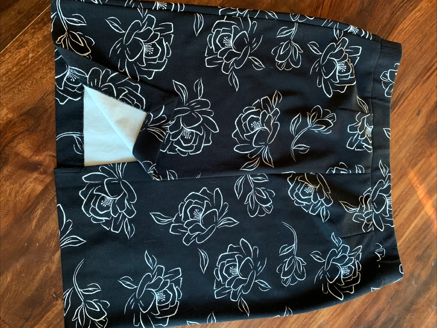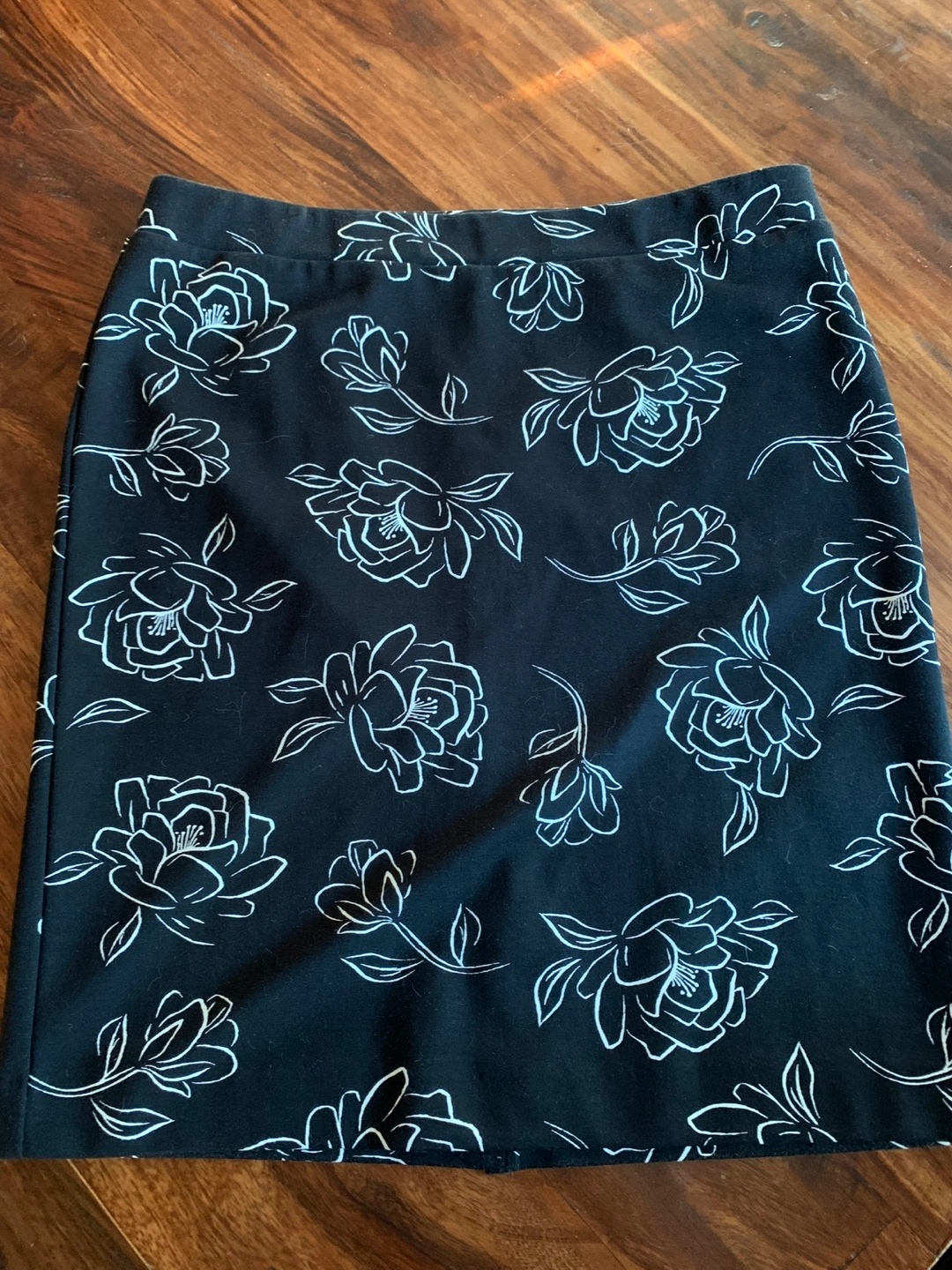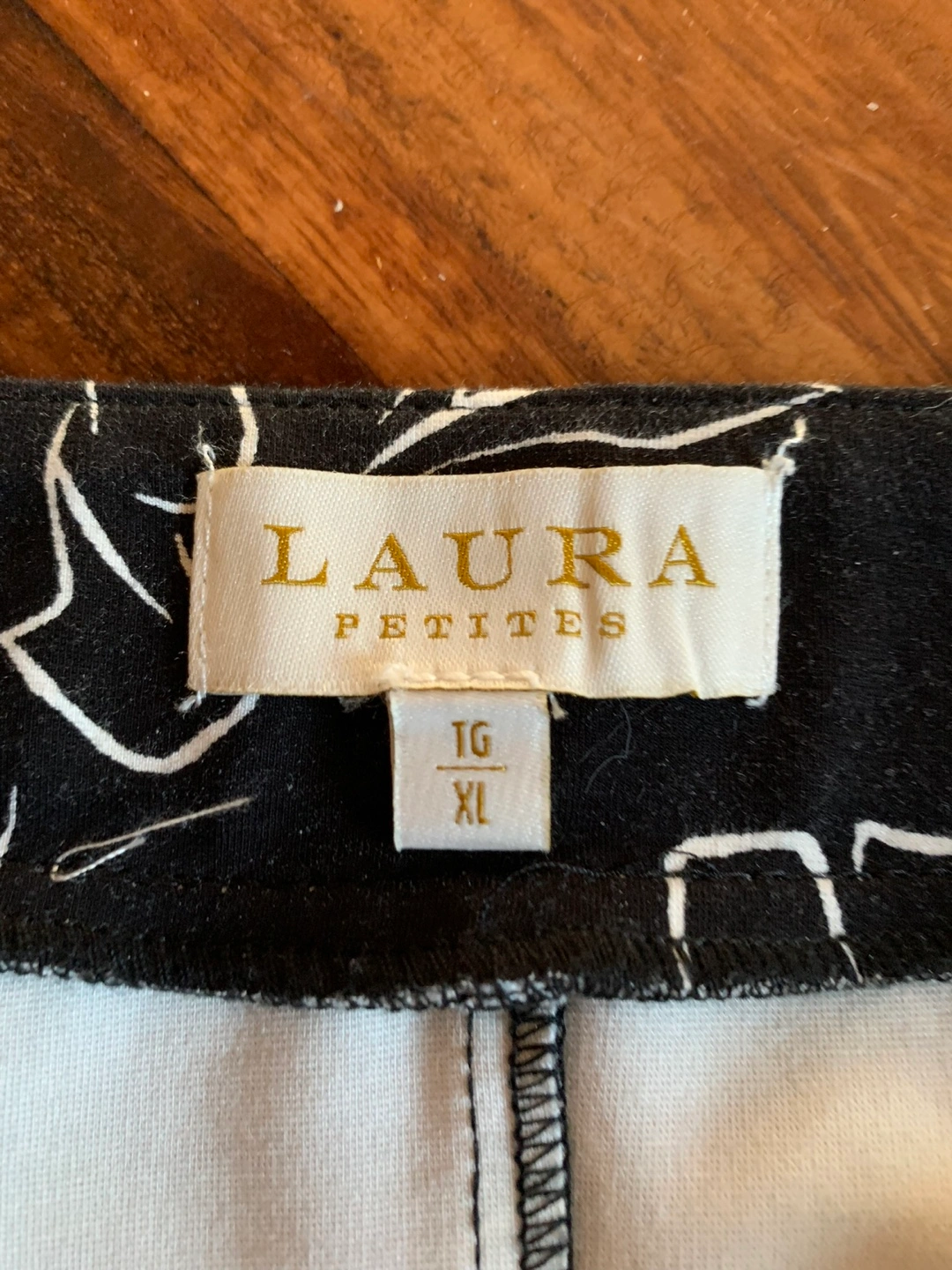Laura Petites skirt in size XL. The skirt is black with a white floral pattern. It's made of 82% rayon, 14% nylon, and 4% spandex. The skirt measures approximately 22 inches in length.