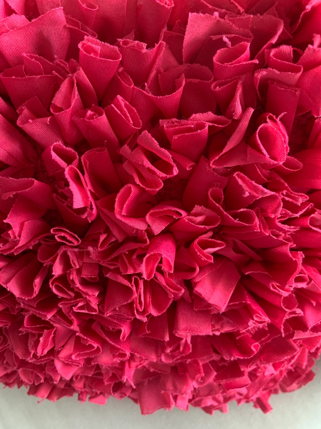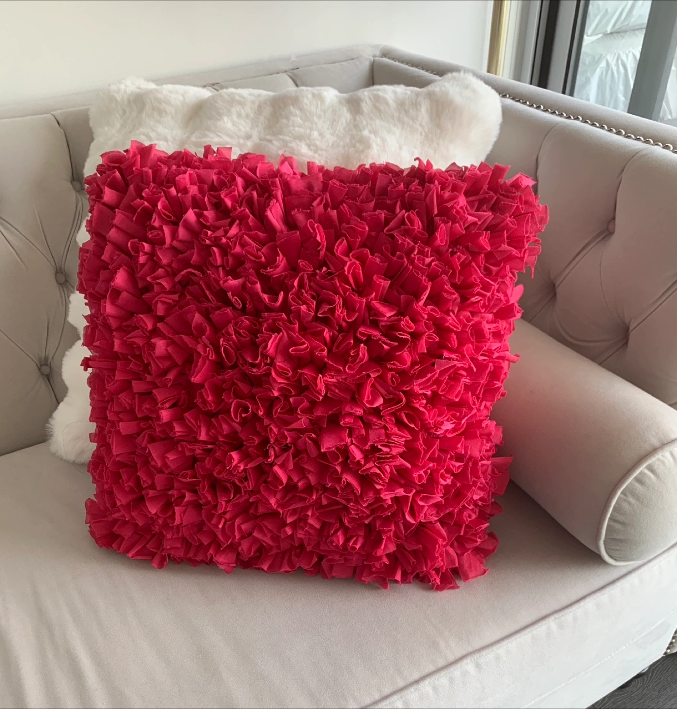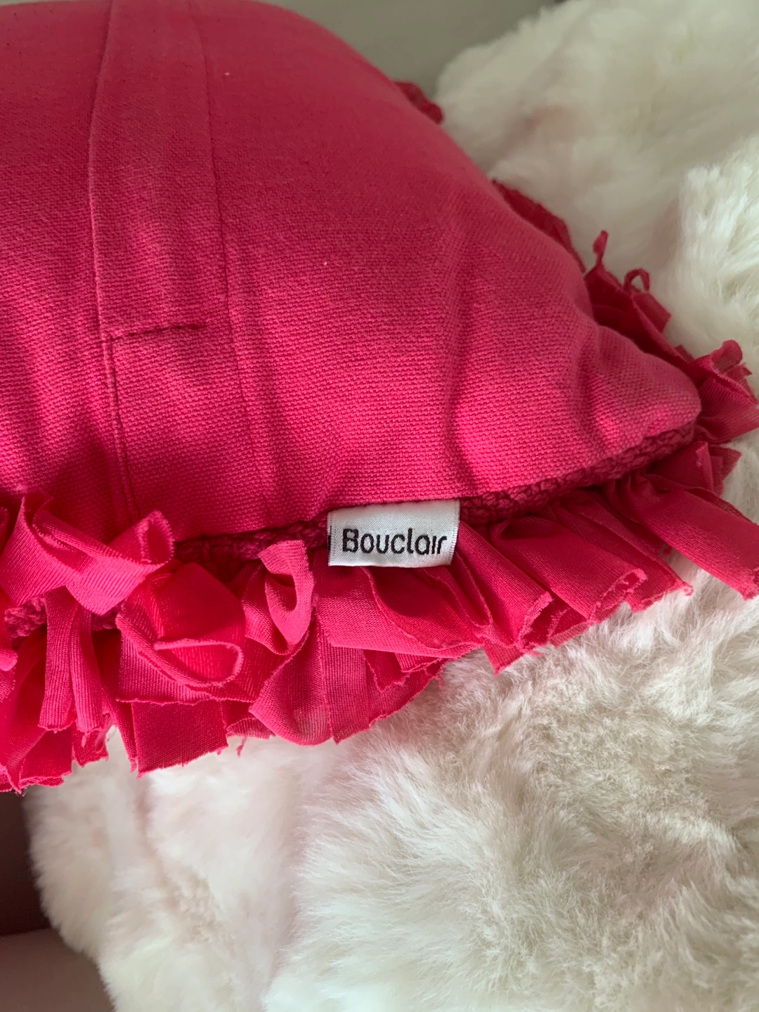 Add a pop of colour to your living space with this vibrant pink ruffle pillow from Bouclair! This eye-catching cushion features a unique ruffle design that adds texture and charm to any sofa, chair, or bed. It's in great shape and ready to bring some fun to your home decor