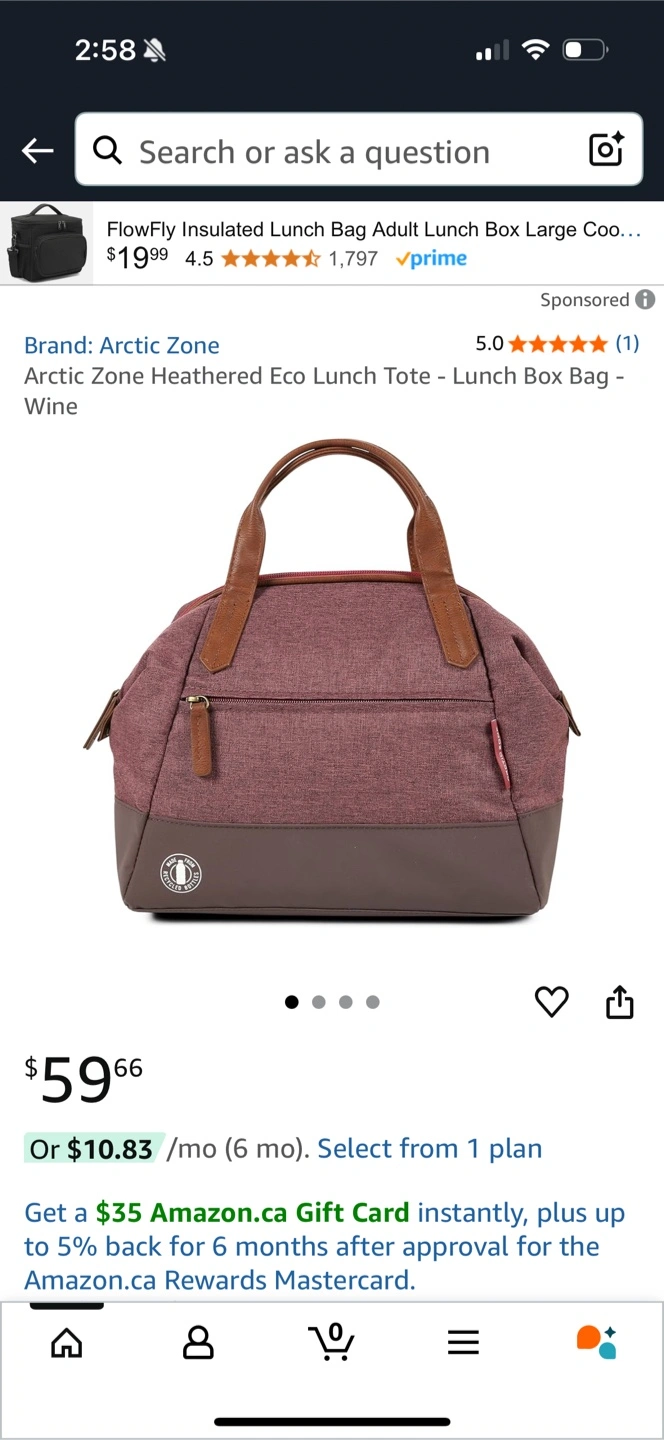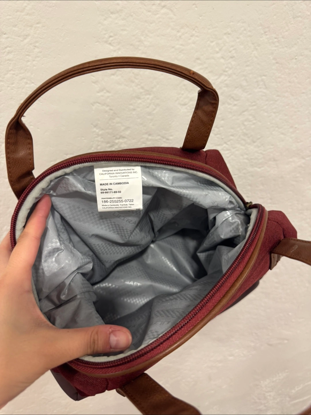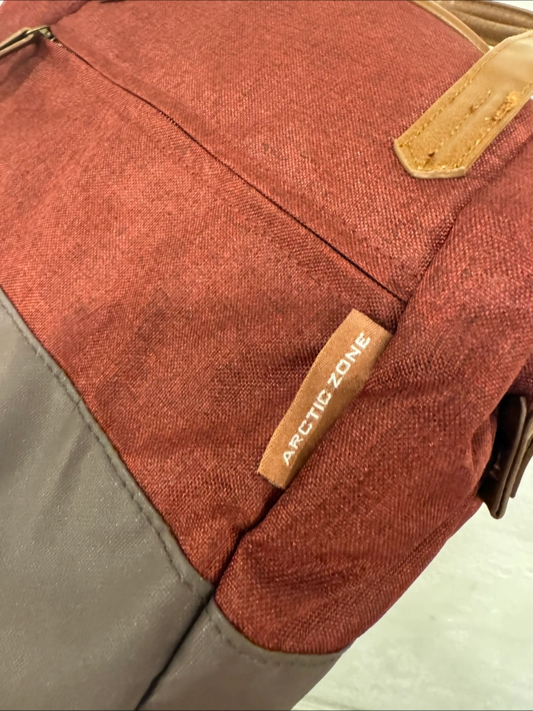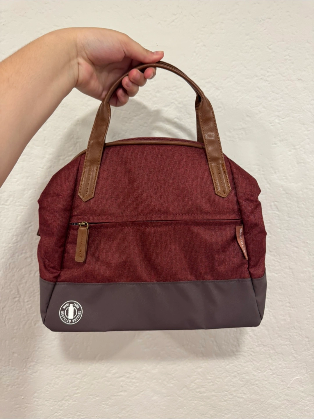 Selling an Arctic Zone Heathered Eco Lunch Tote in a lovely wine colour. It's perfect for carrying your lunch in style! The tote features a stylish design with brown handles and a durable construction. Originally bought for $59.66, this lunch tote is a great eco-friendly option made from recycled bottles