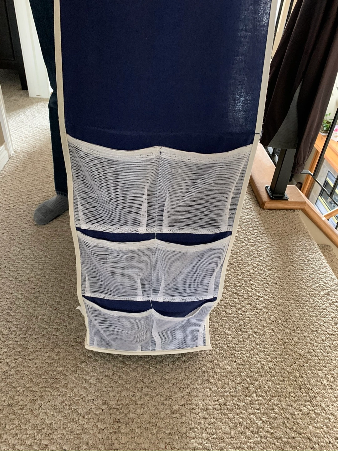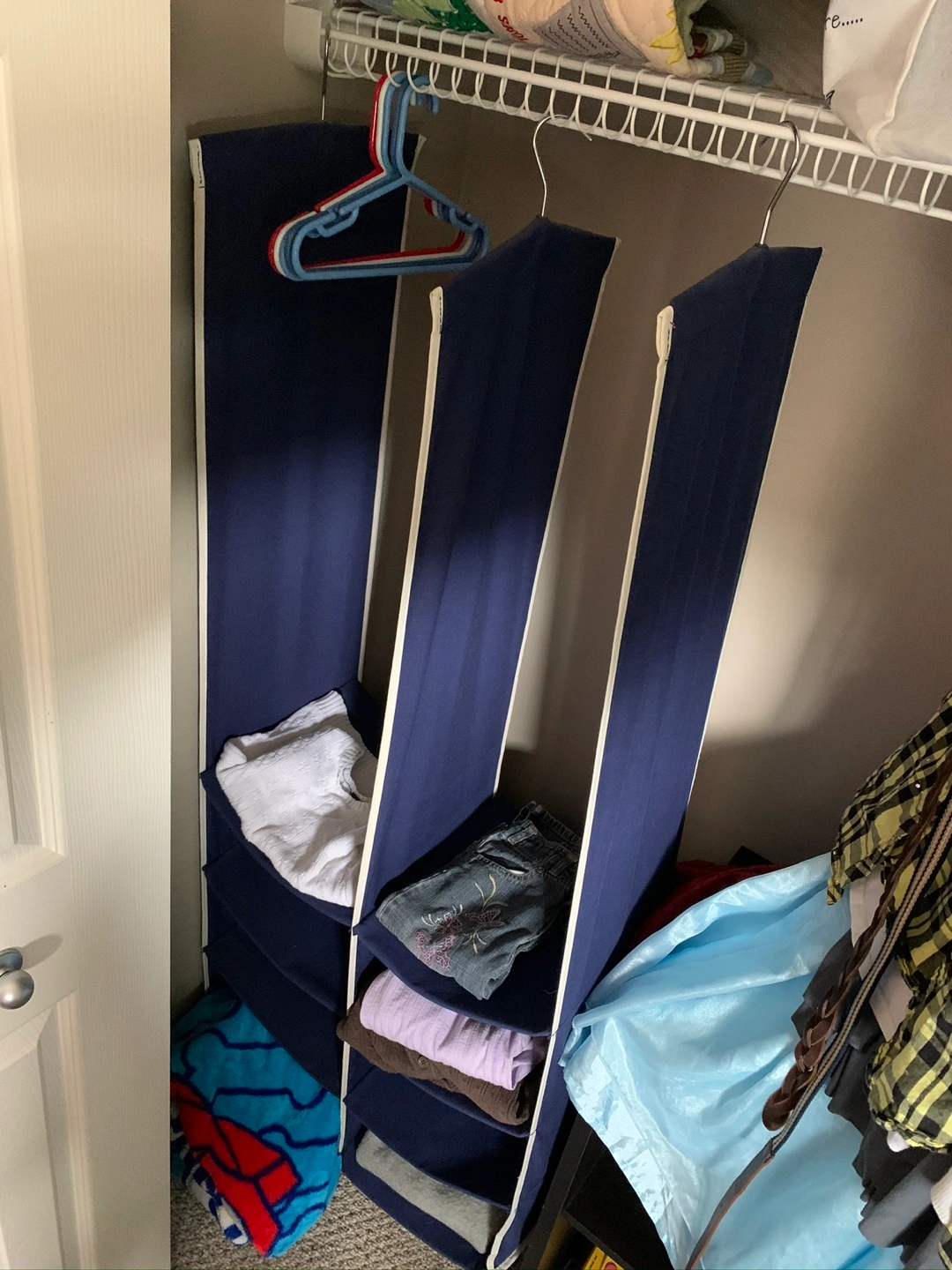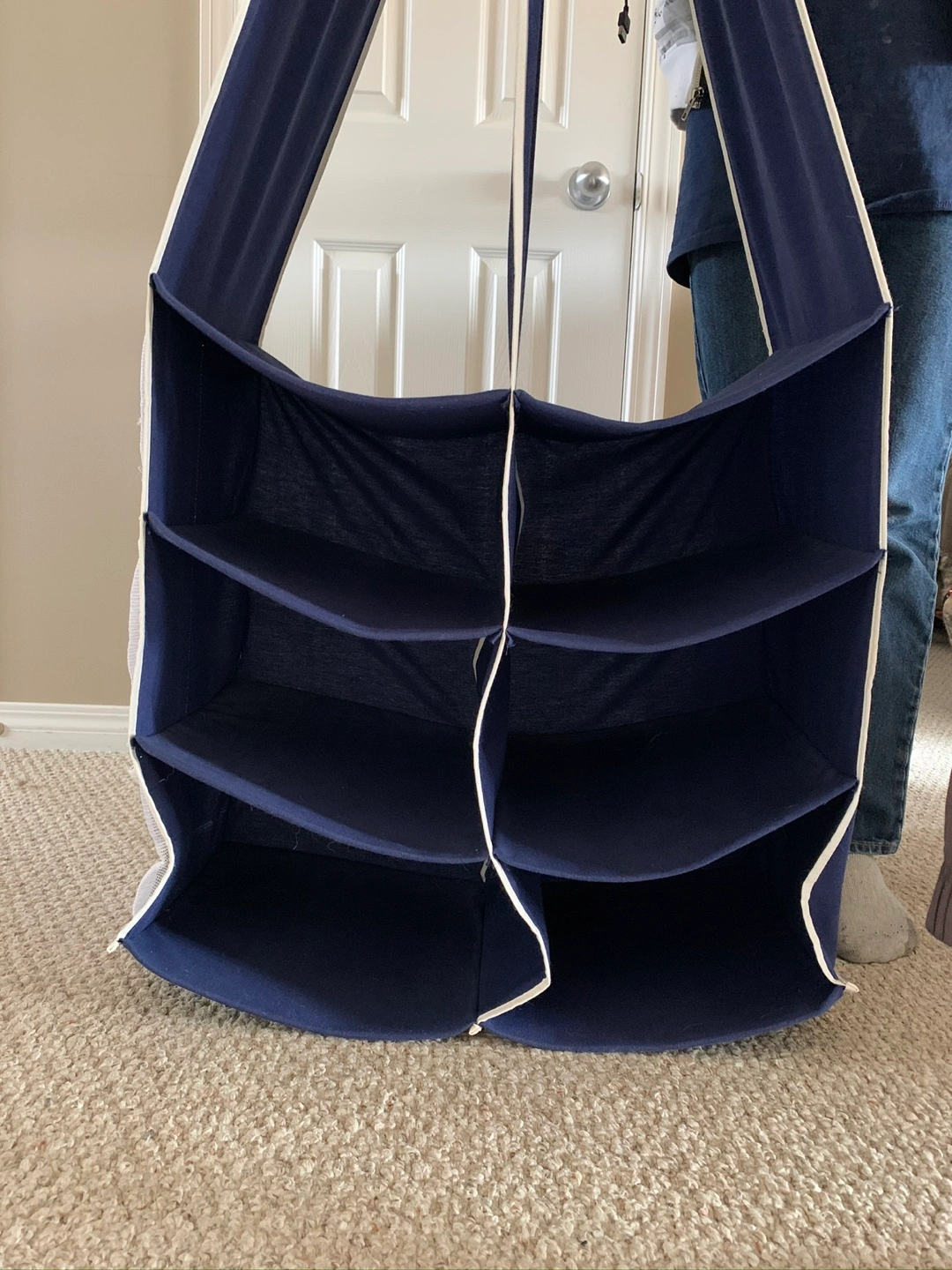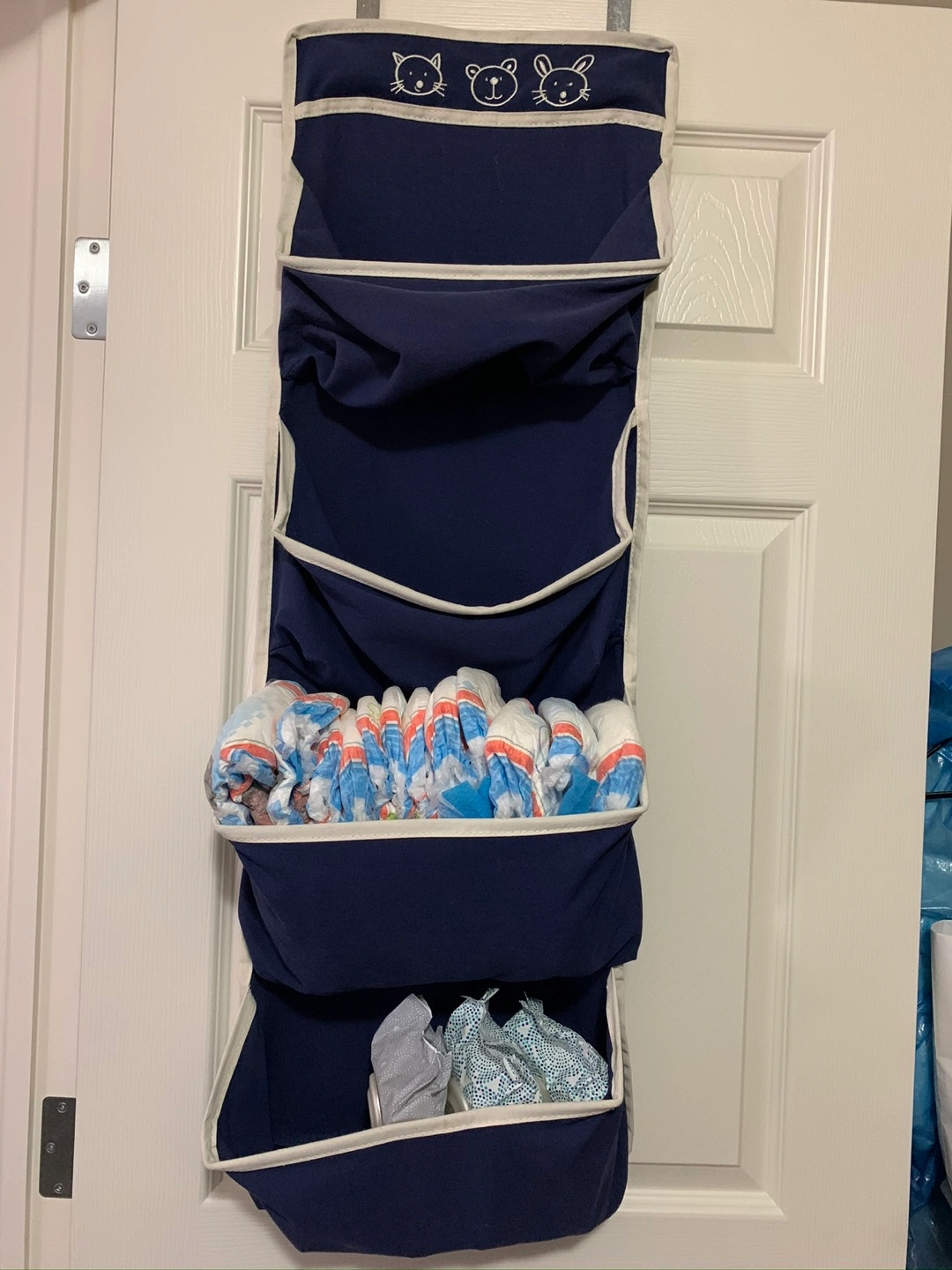 Declutter your closet with this handy hanging organizer! It's a great way to maximize space and keep things tidy. The navy blue colour is a nice neutral that fits in anywhere. Perfect for clothes, accessories, or even baby items like diapers