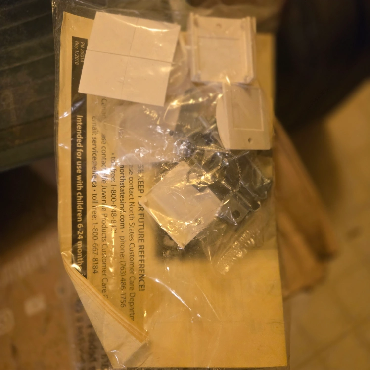 I have two bags of hardware for installing plastic baby gates. They include various brackets and screws. We used the baby gates, but didn't need the hardware