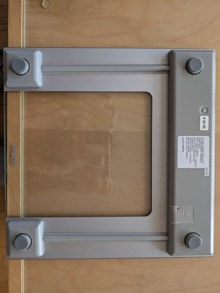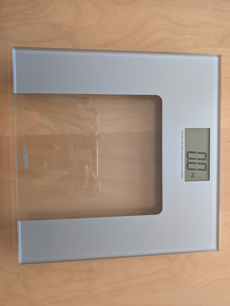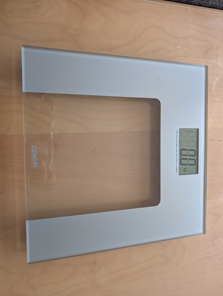 This is a Conair glass digital scale. It displays weight in both kilograms and pounds.