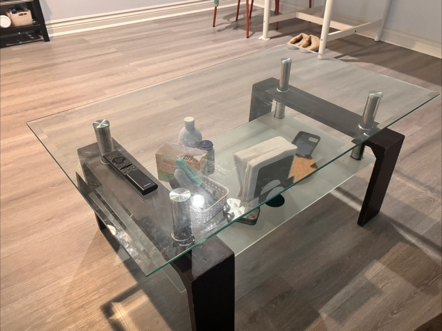 Selling a glass coffee table with a dark brown frame. It has a modern look with its sleek glass top and silver accents. There is also a lower shelf for storage or display