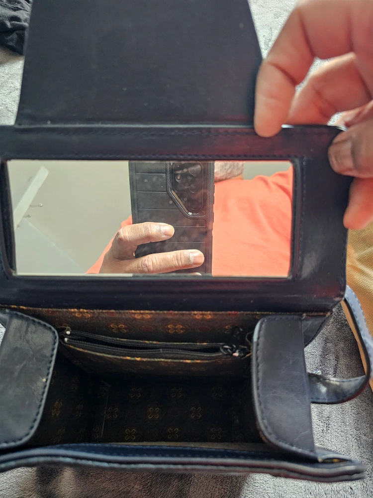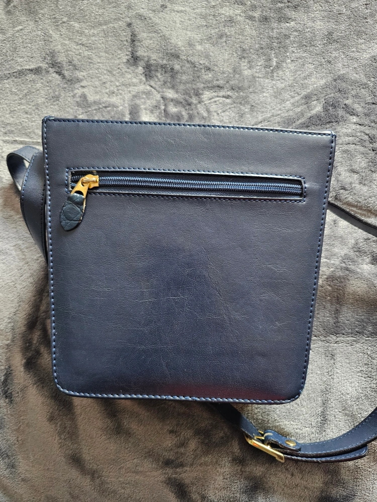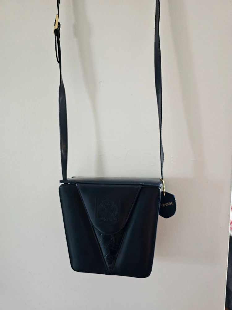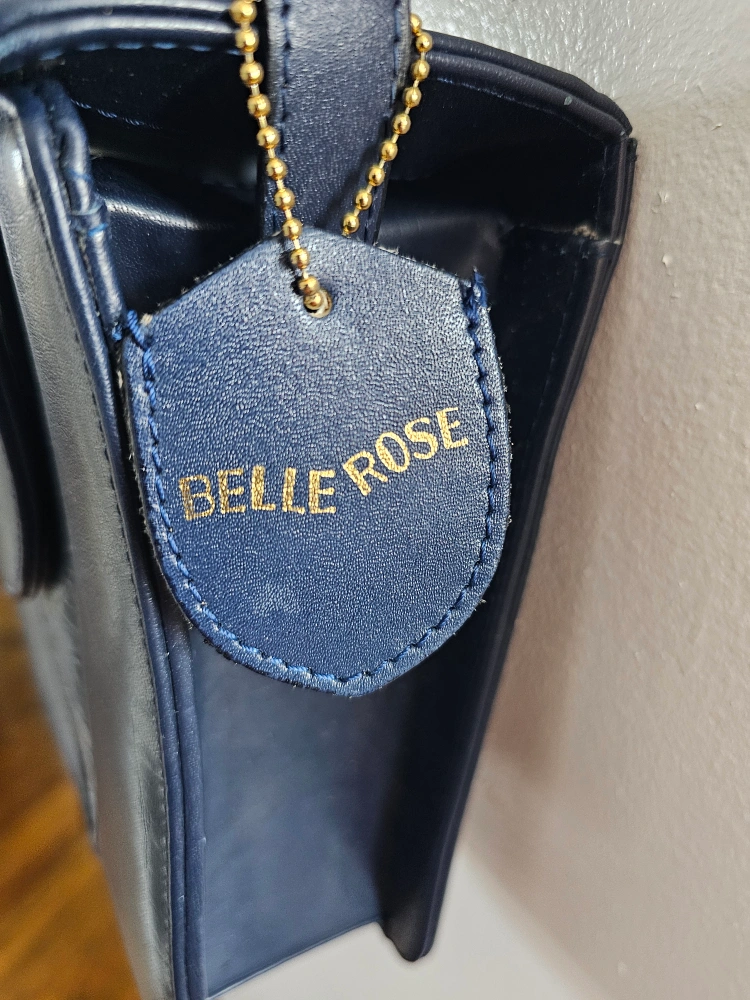 1000+Selling a Belle Rose crossbody bag in navy blue. It's in great condition and has a unique design. The bag features a top handle and a detachable shoulder strap. Inside, you'll find a spacious main compartment and a zippered pocket for your valuables. Perfect for everyday use!