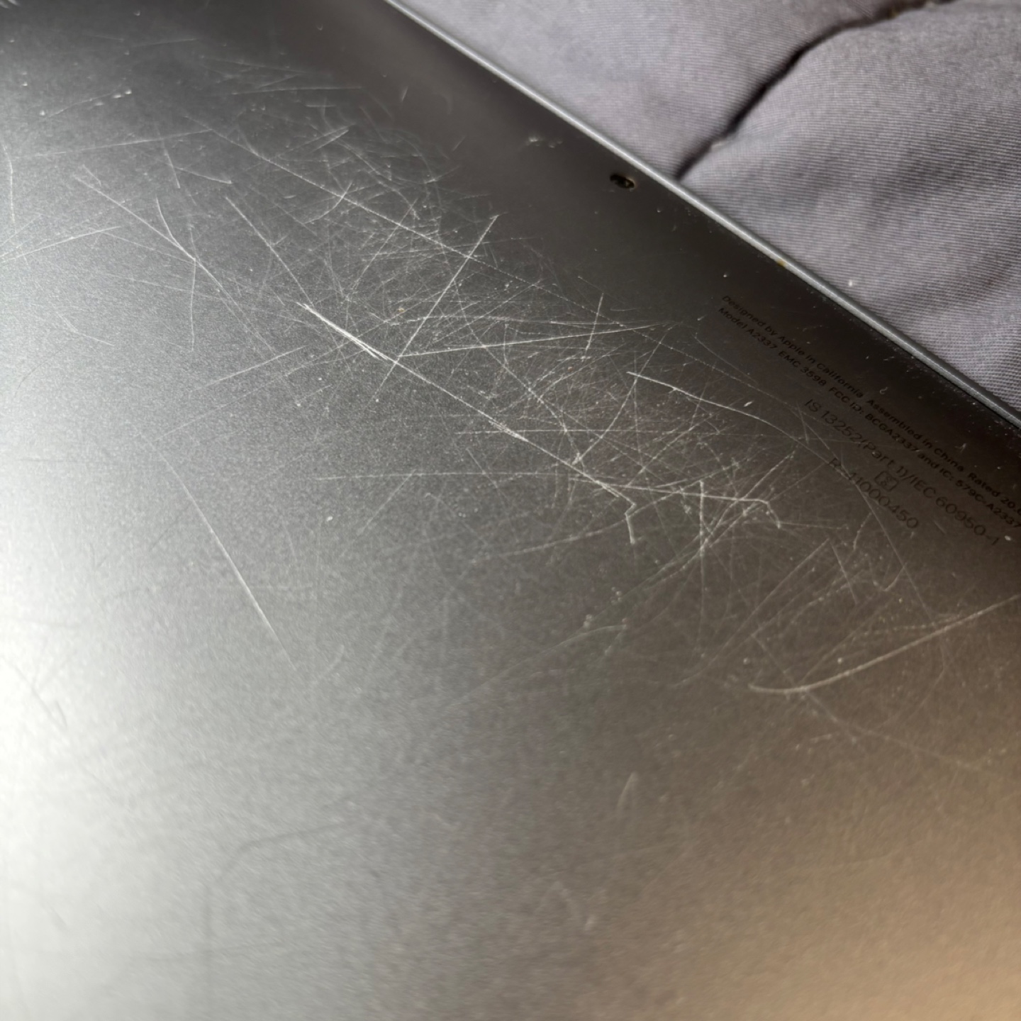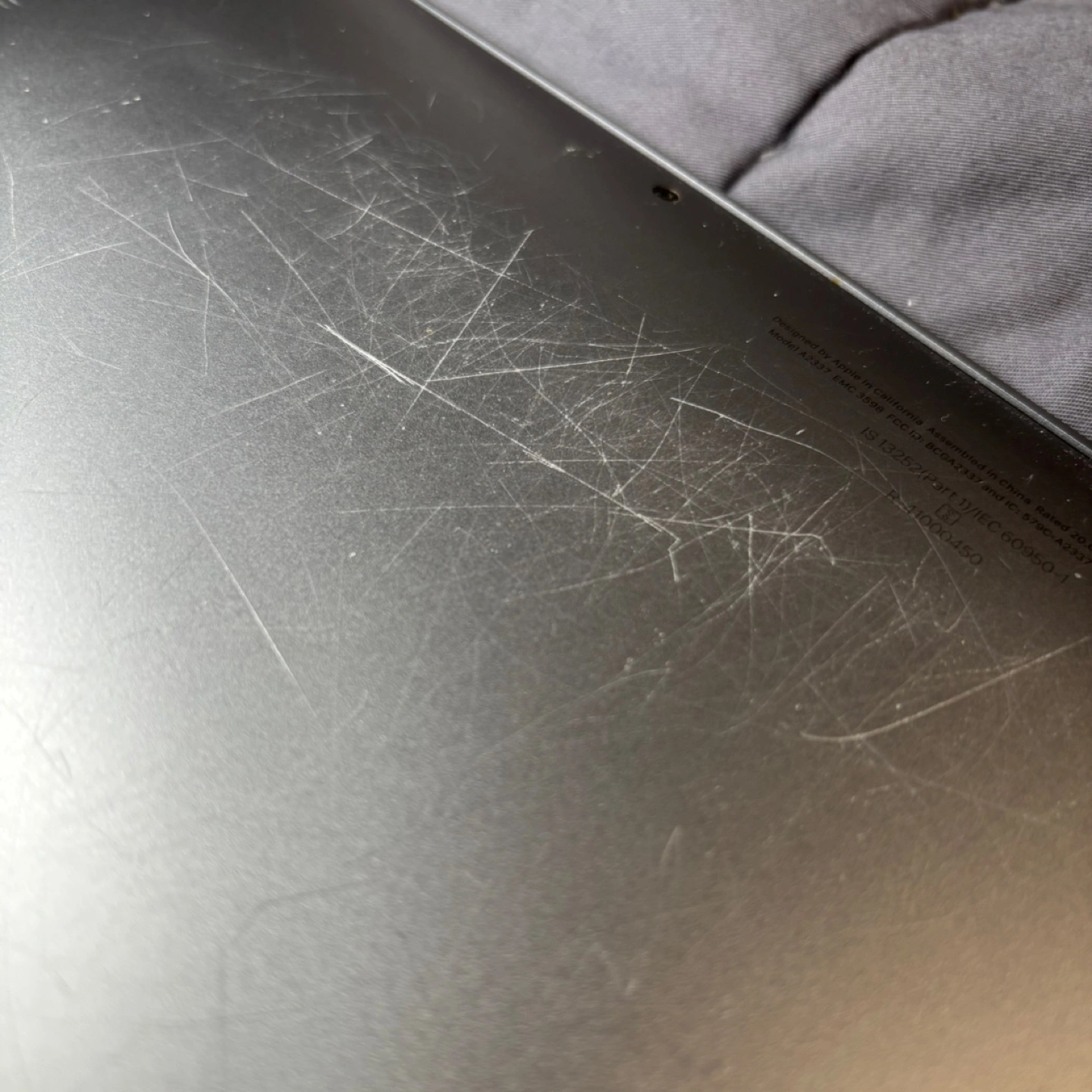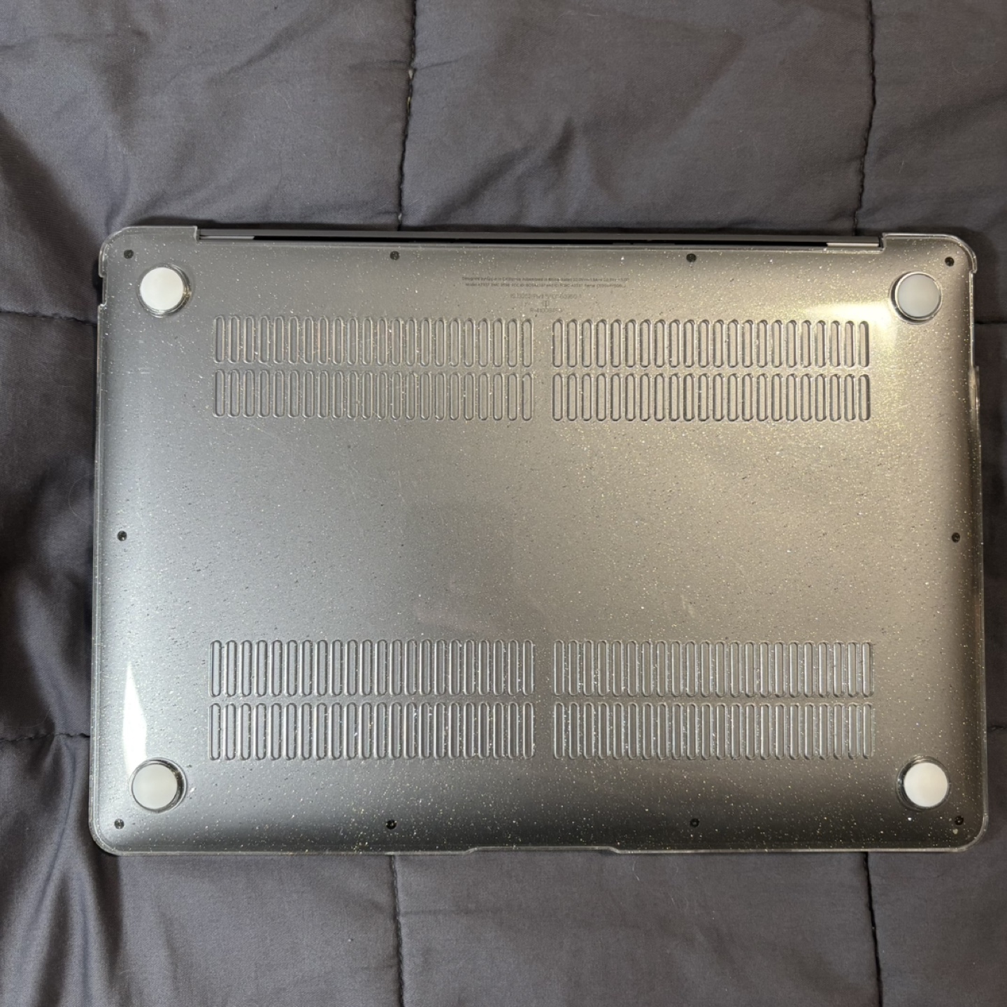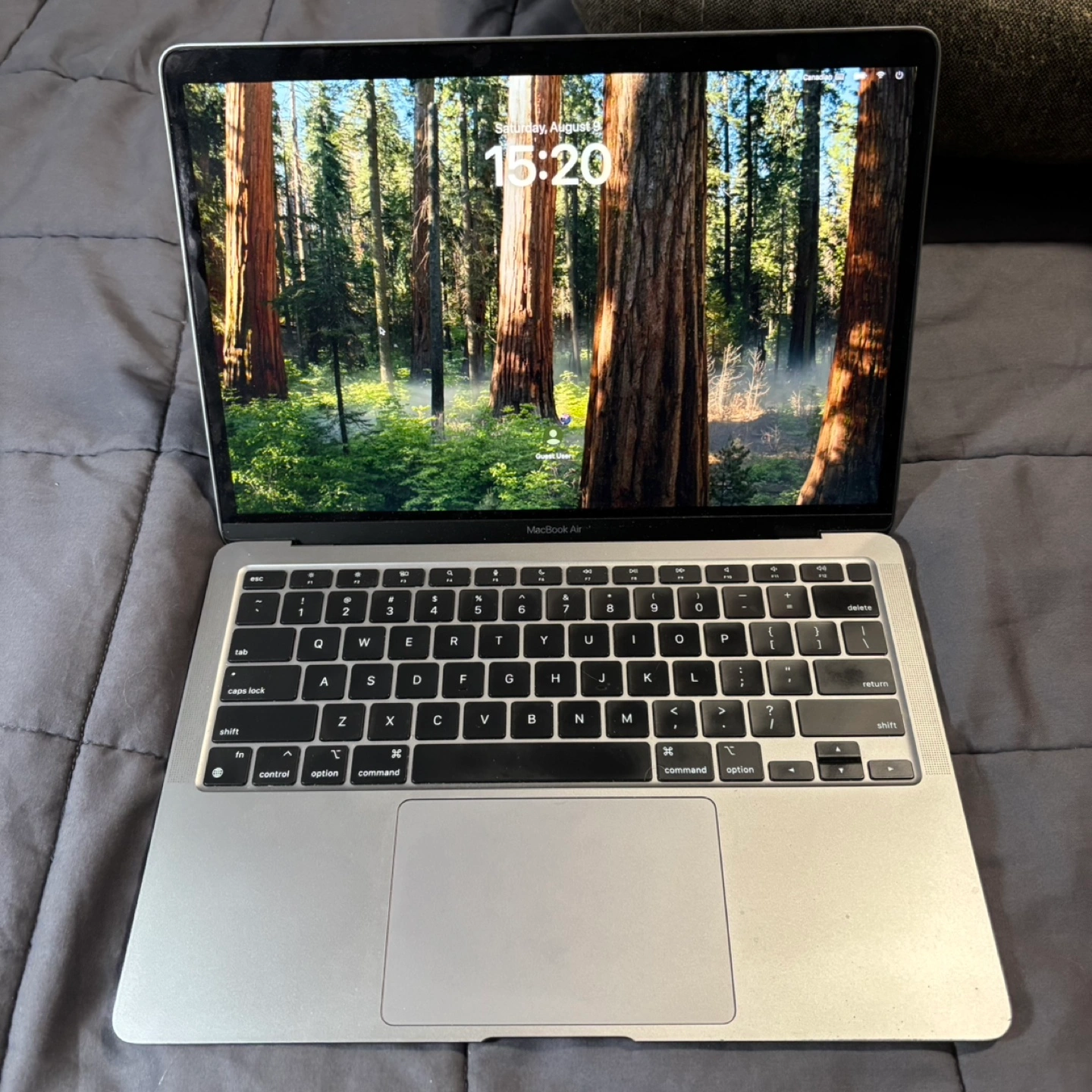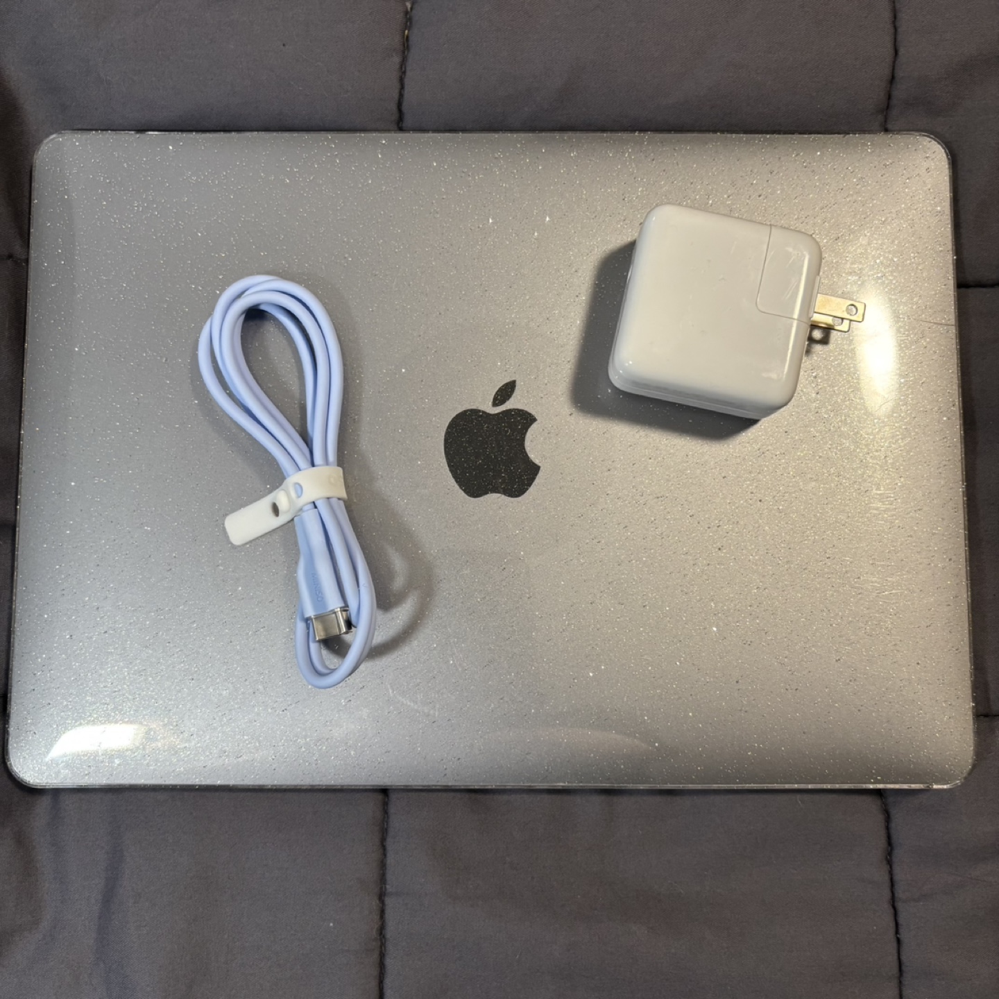 Fully working 2020 M1 MacBook Air with 8GB RAM and 500GB SSD. Battery 81%. Some dents on the bottom edge and discolouration on the Apple logo from a sticker. Includes clear glitter hard case, genuine Apple charger and non-Apple charging cable.