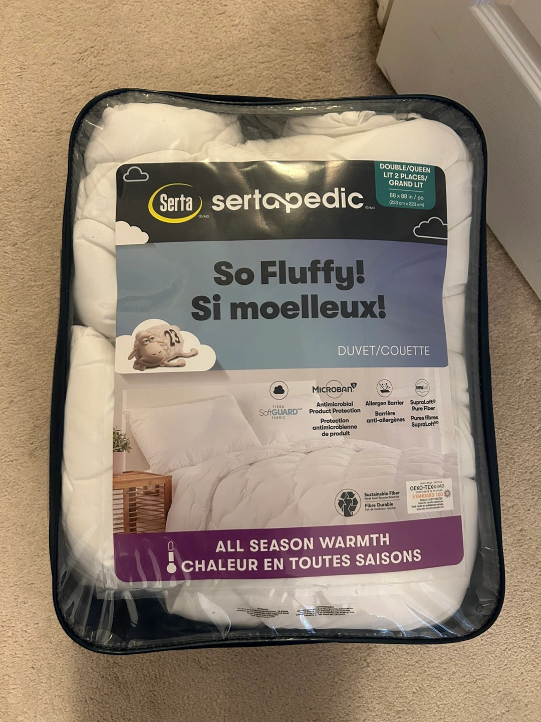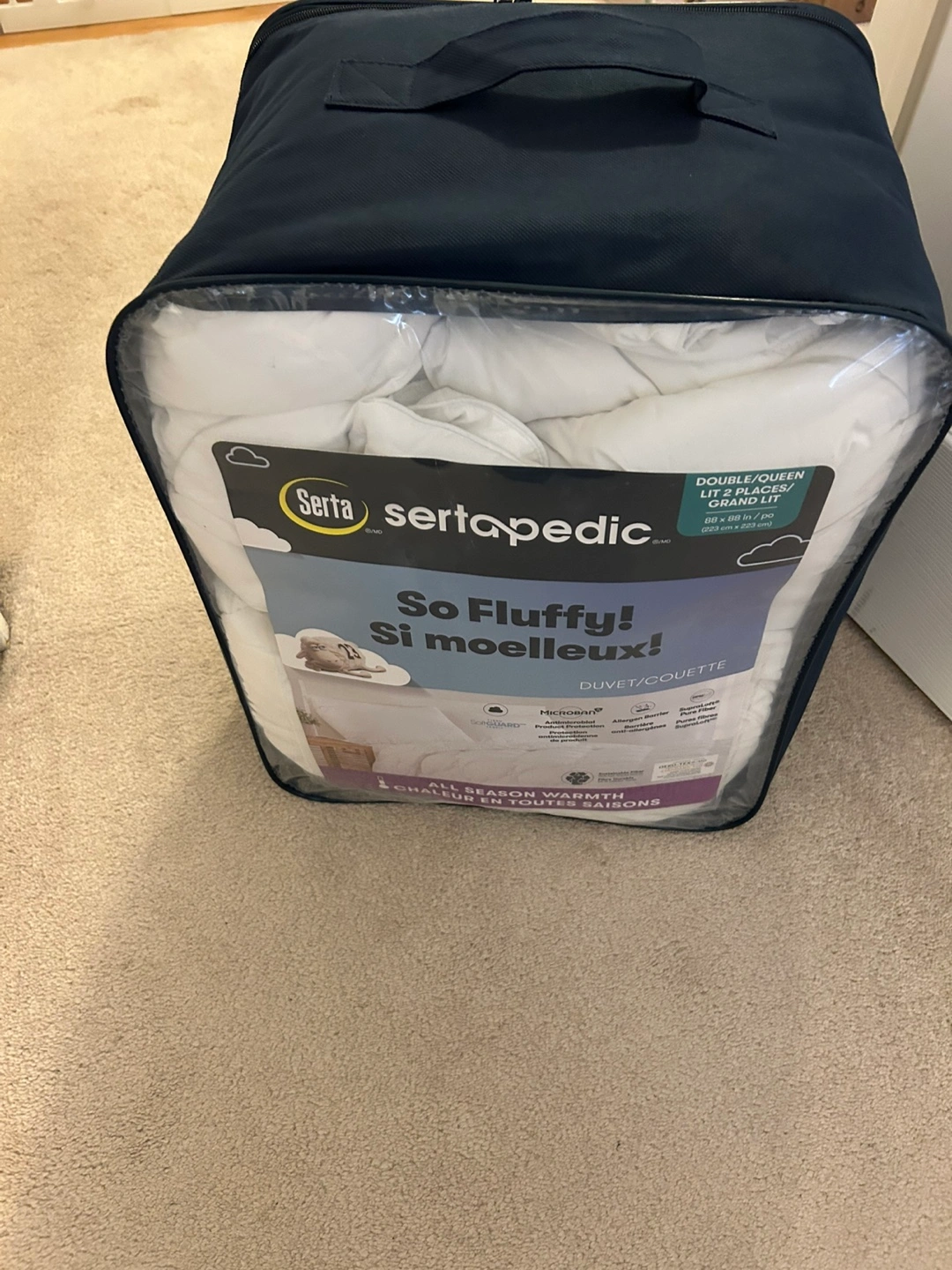 70Selling a Serta Sertapedic duvet in double/queen size! It's still in its original packaging. This duvet is designed for all-season warmth, so it's perfect year-round. It's also got antimicrobial product protection and an allergen barrier for extra comfort. The packaging is included! Never Used.