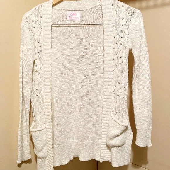 This is a cute cardigan for girls from Justice! It is a size 10 and in great condition. The cardigan is off-white and features small silver and gold embellishments.