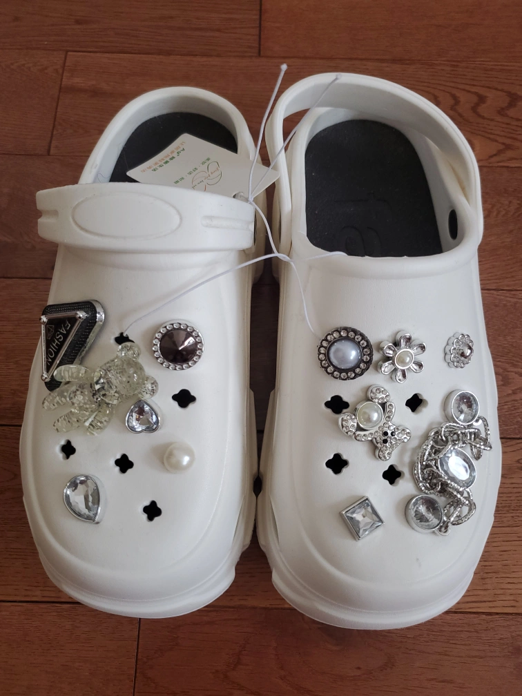 These white clogs are brand new and ready for a new home! They come adorned with a variety of cute charms, adding a unique touch to your footwear. Perfect for casual wear or adding a bit of fun to your outfit