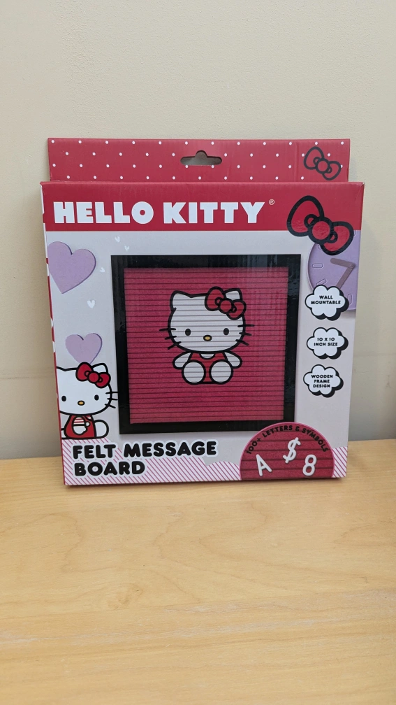 I have a brand new Hello Kitty Felt Message Board for sale! It's still in its original packaging. It is wall mountable and has a 10 x 10 inch size. Comes with a wooden frame design and 100+ letters & symbols