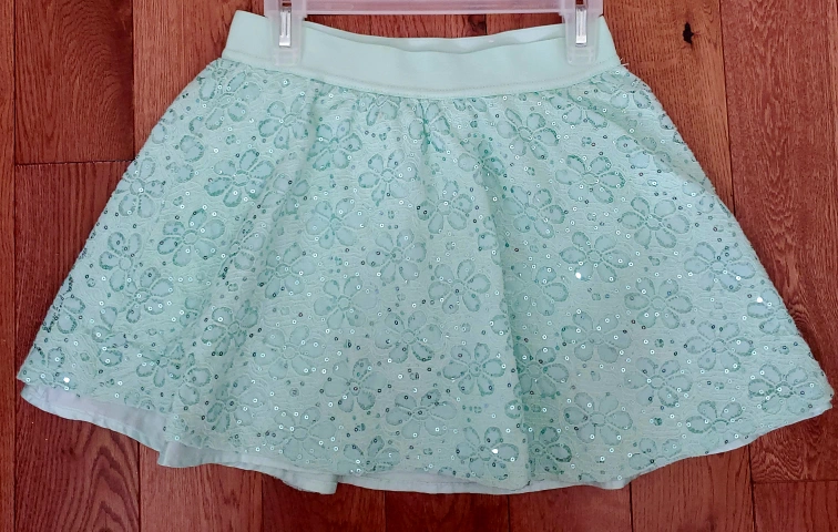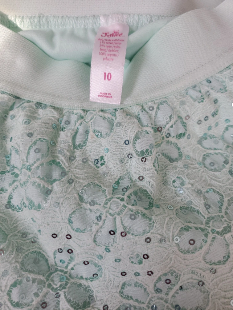 Selling a cute Justice girls skirt in size 10! It's a lovely light green colour with a fun, sparkly design. Perfect for parties or everyday wear!