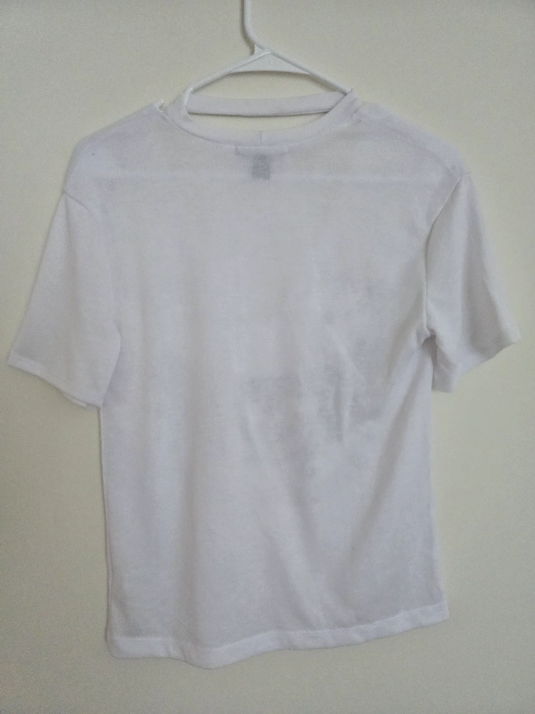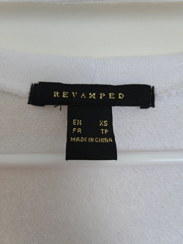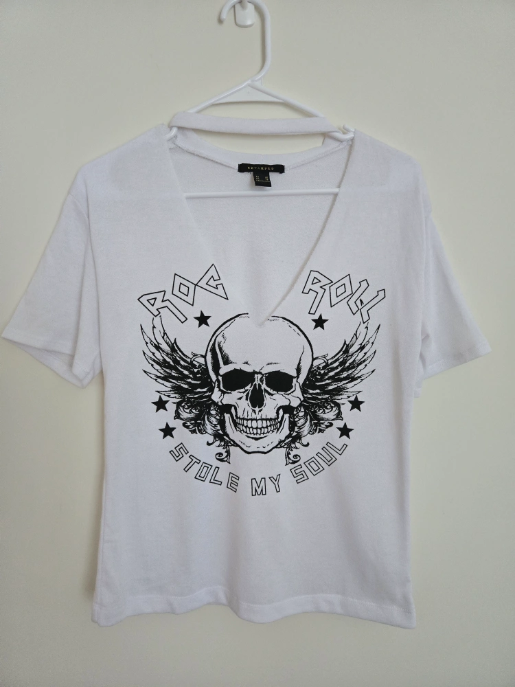 White graphic tee from Revamped! It's a size XS and has a unique design with neck cut out featuring a skull with wings and the words "Rock Roll Stole My Soul" on the front. It's in great condition