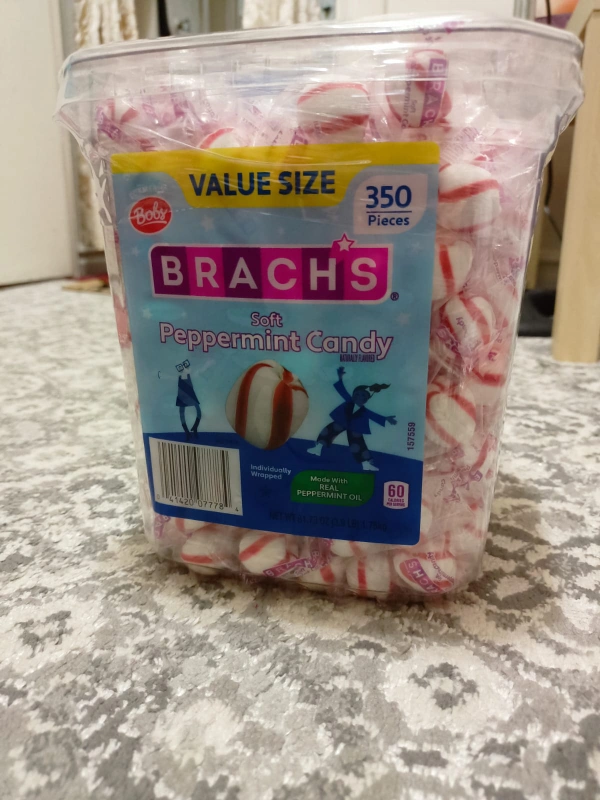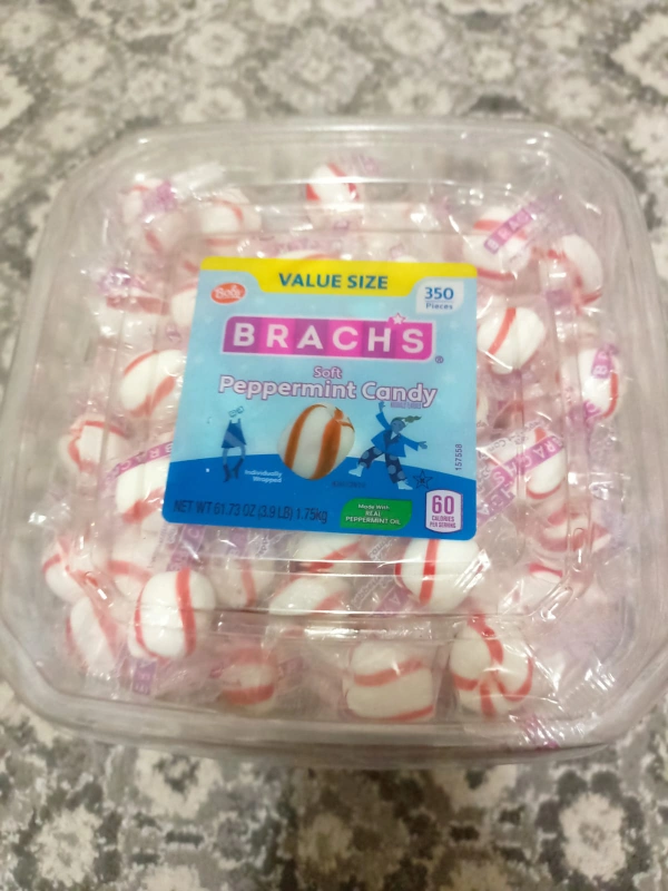 Selling a value size container of Brach's Soft Peppermint Candy! It contains 350 pieces and is made with real peppermint oil. Net weight is 61.73 oz (3.9 lbs) or 1.75kg