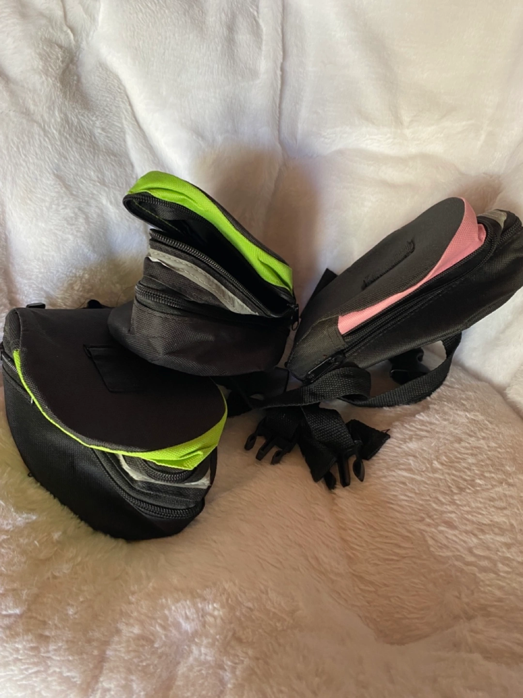 Each has 2 zippered compartments that can hold keys, phone, money etc.