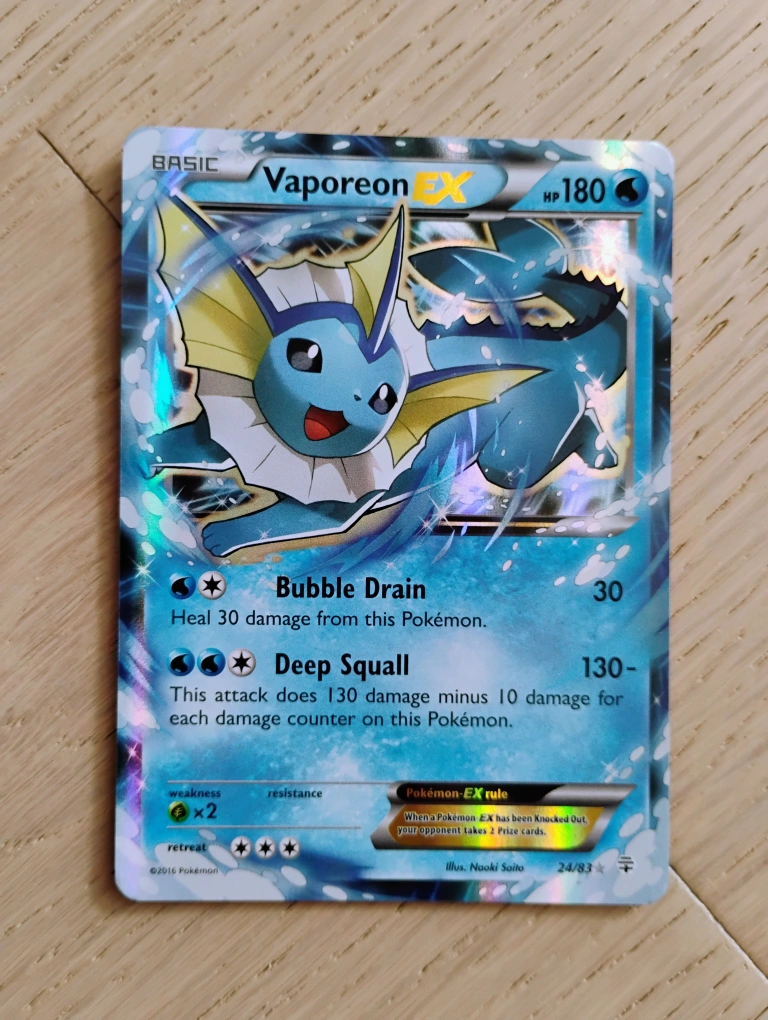 Selling a Vaporeon EX Pokemon card from the Generations series! It's lightly played. A must-have for any Eeveelutions and Pokemon collector! Price will be slightly lower than market.