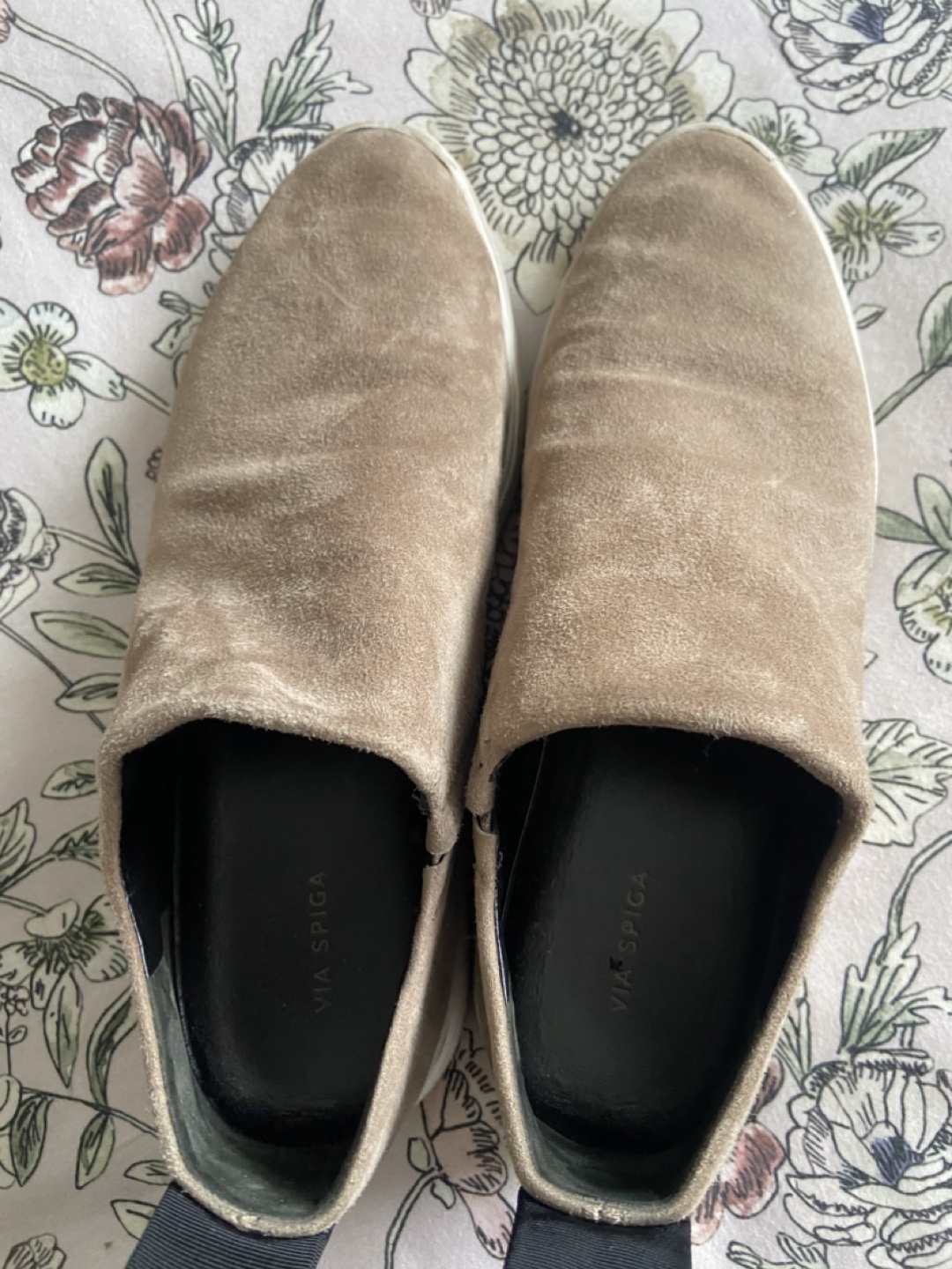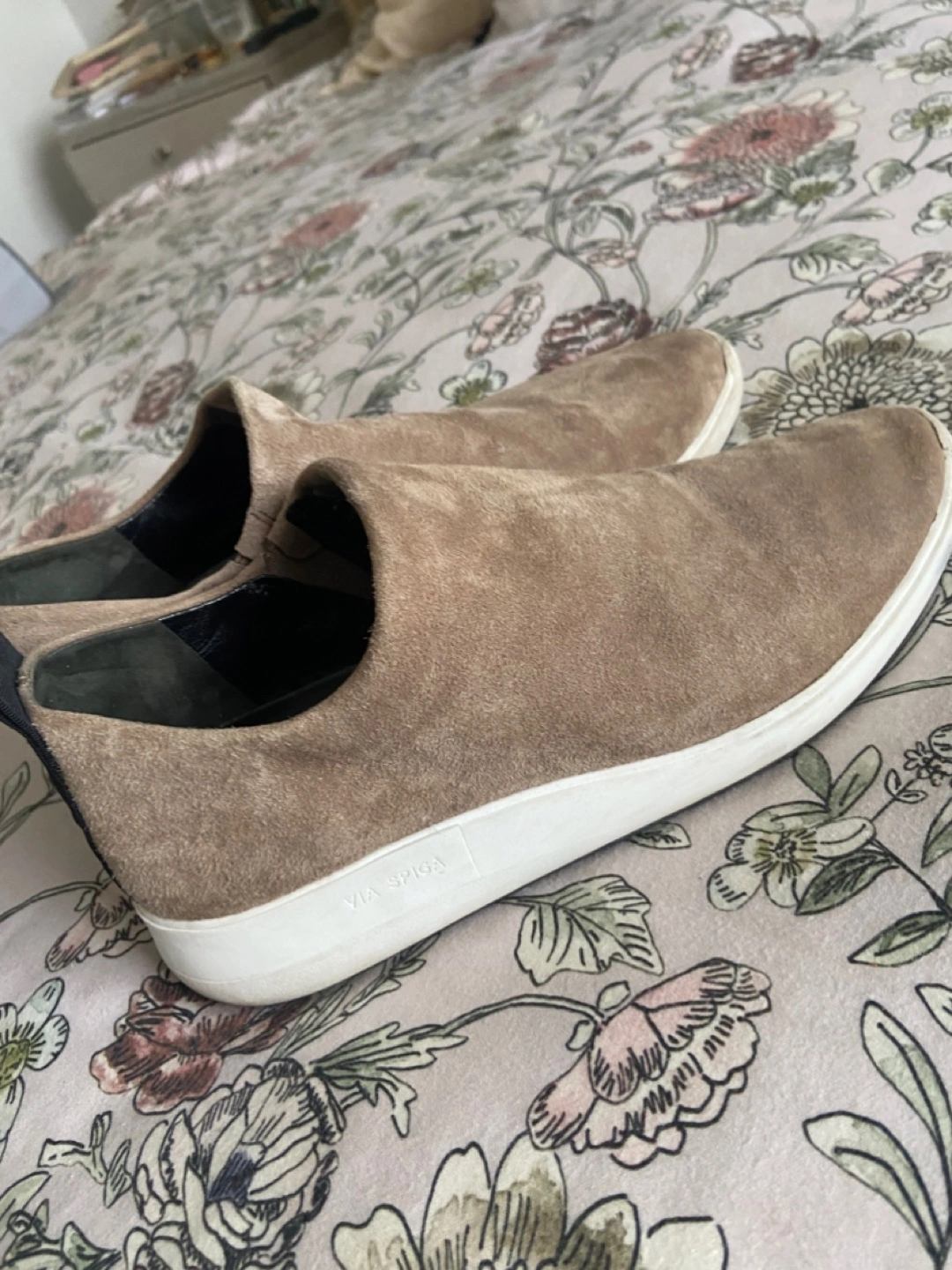 Selling a pair of Via Spiga slip-on sneakers! They're a stylish and comfy choice for everyday wear. The upper material is suede and they have a white sole. Perfect for adding a touch of casual elegance to your outfit