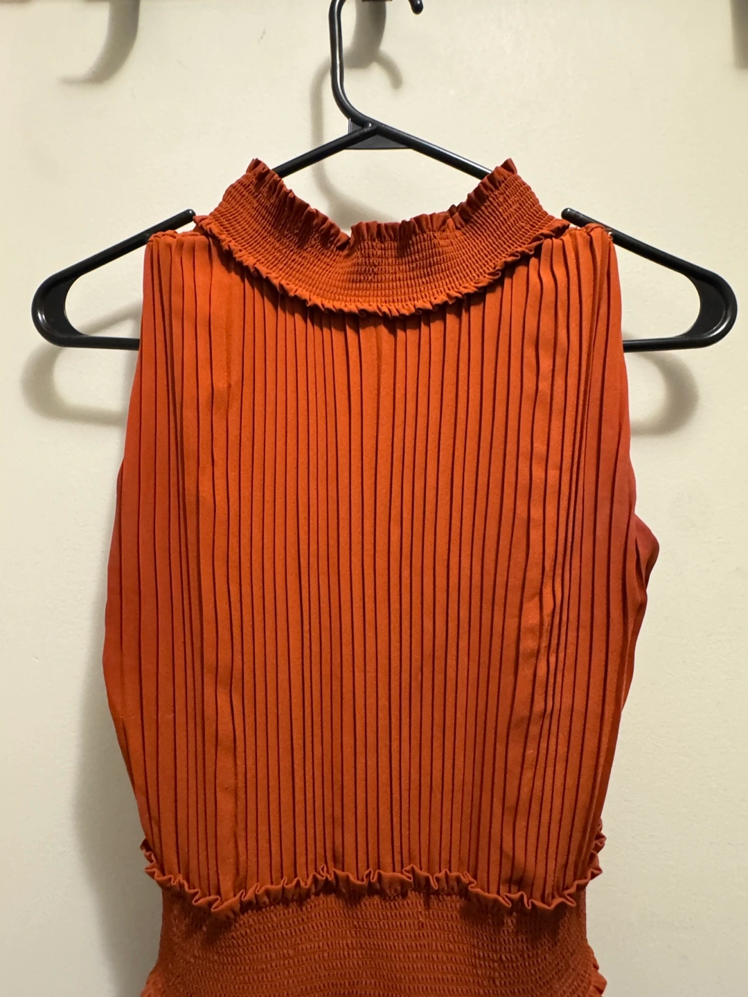 This is a lovely rust-coloured dress with pleated detailing. It features a unique smocked high neckline and a stretchy smocked waist. Perfect for a variety of occasions!