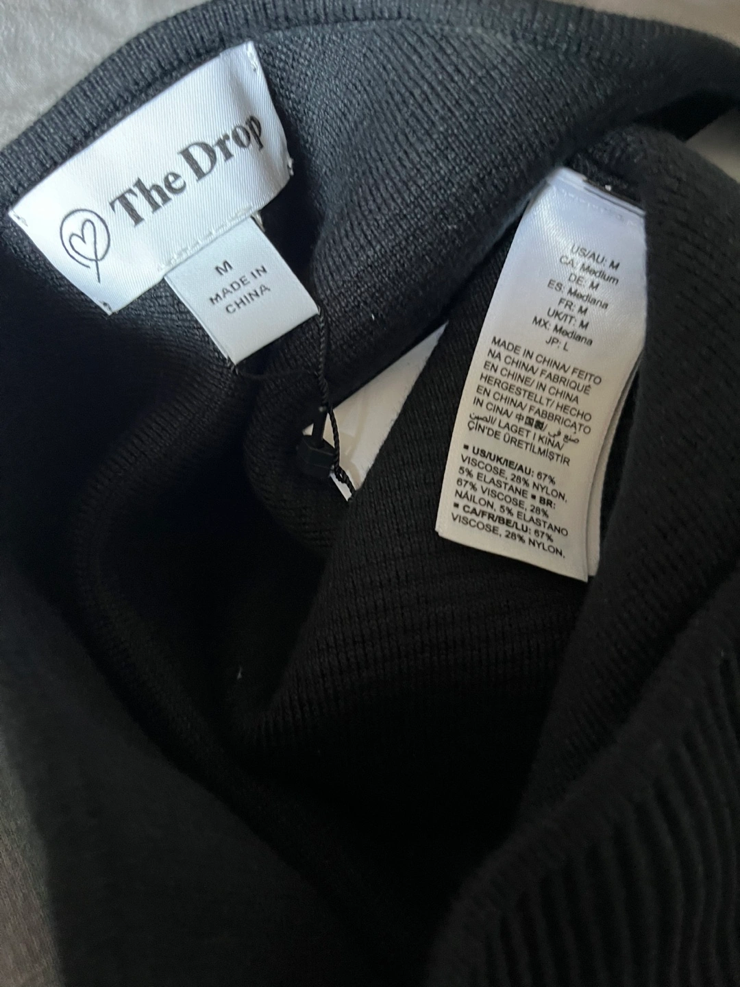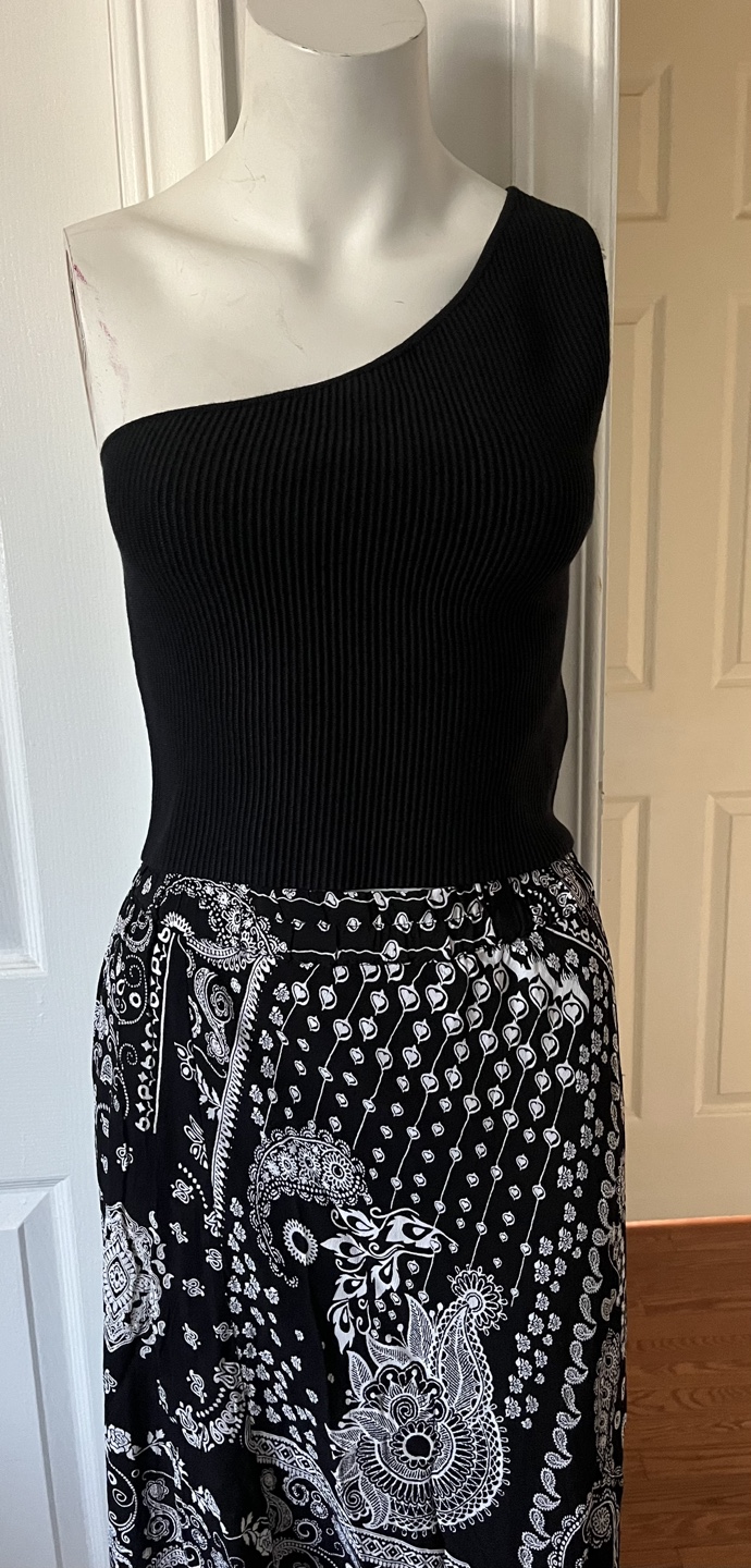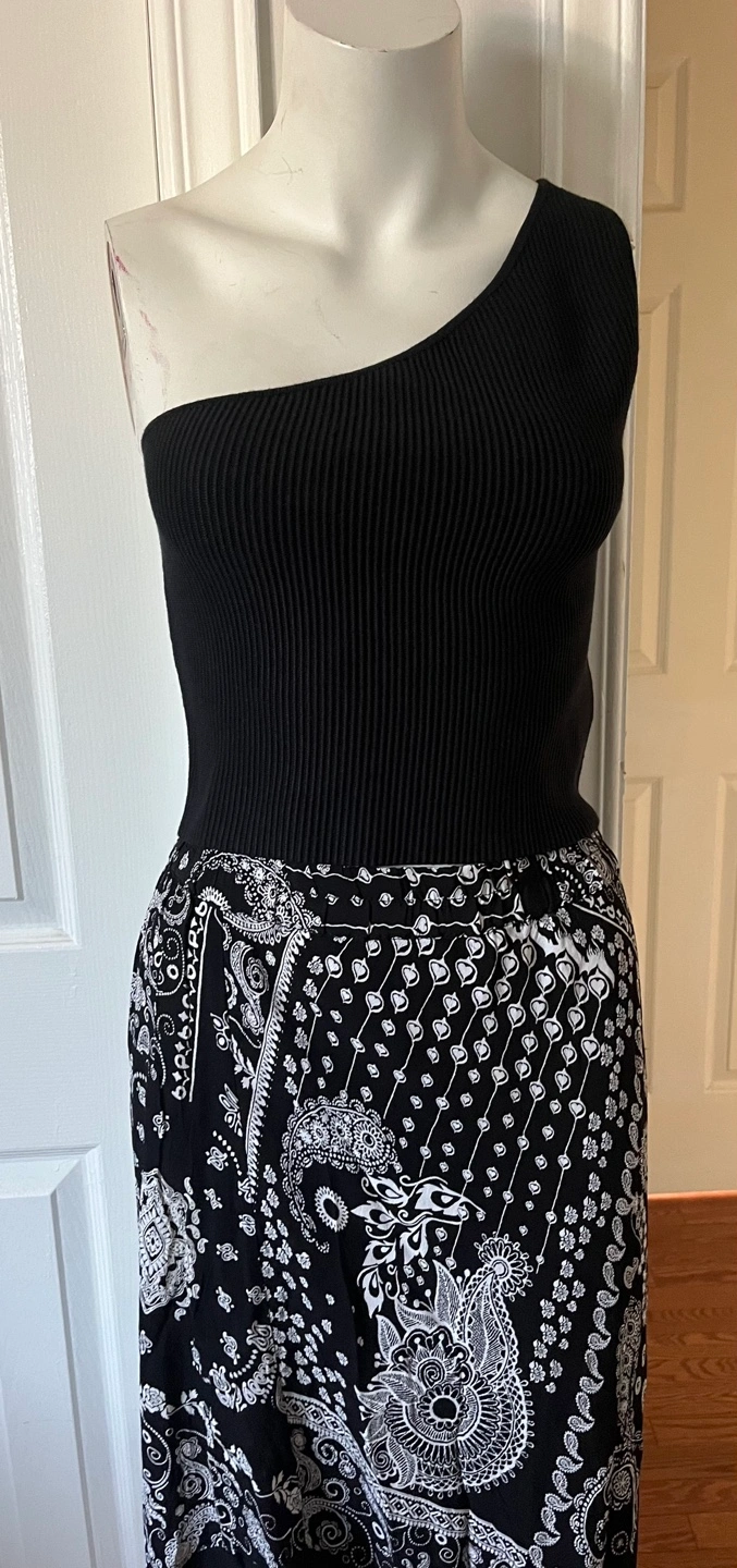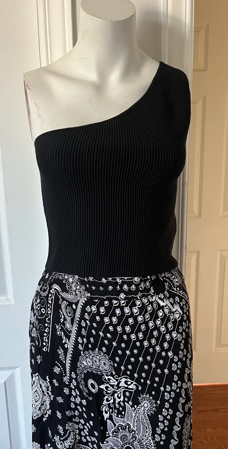 This is a cute one-shoulder top from The Drop. It's a size medium and features a ribbed texture on the top portion. The material is made of 67% viscous,28% nylon, and 5% elastane
