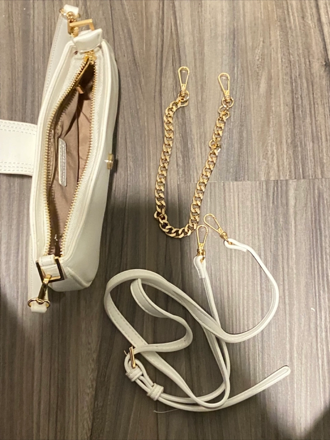 Selling a cute white shoulder bag! It comes with an additional chain strap and a white adjustable strap so you can switch up the look. The bag is in great condition and perfect for adding a little something extra to your outfit