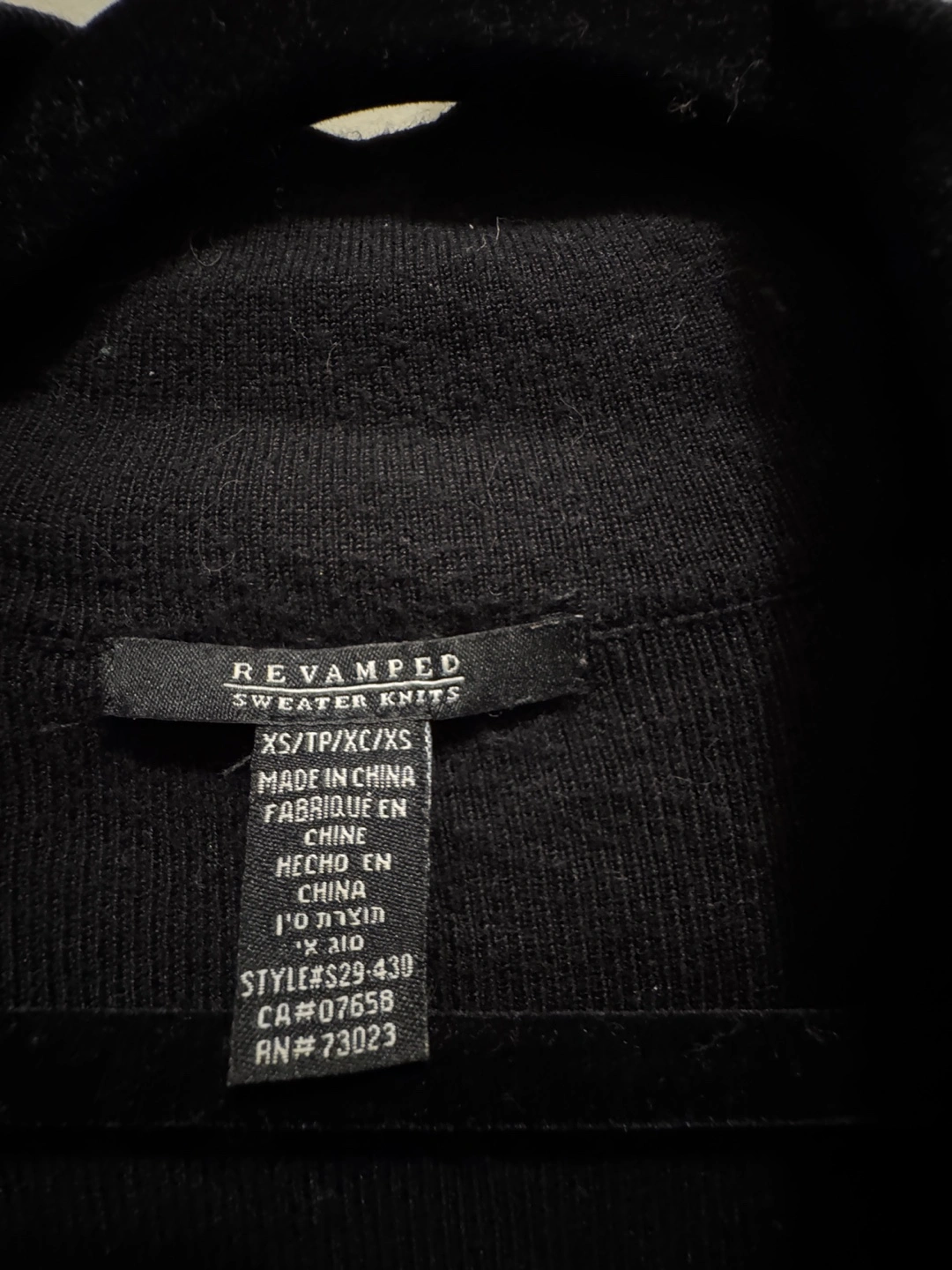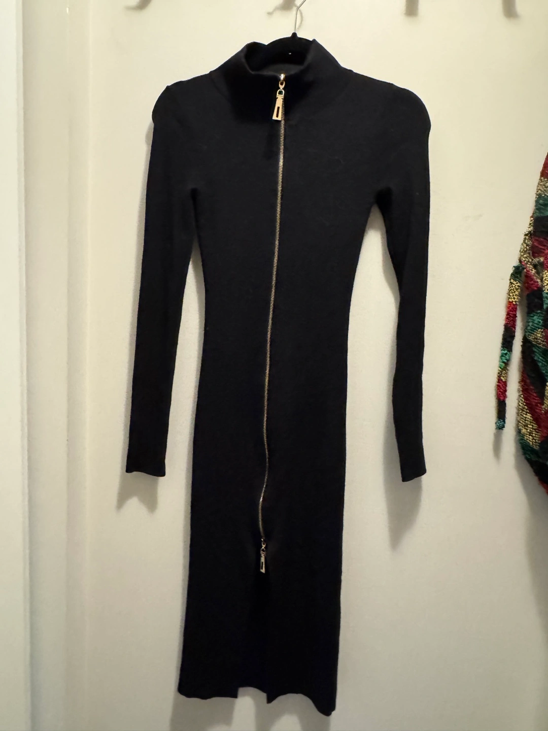 Selling a ReVamped Sweater Knits dress in black. It's a size XS and features a stylish zipper down the front. Perfect for a night out or a cozy day in!