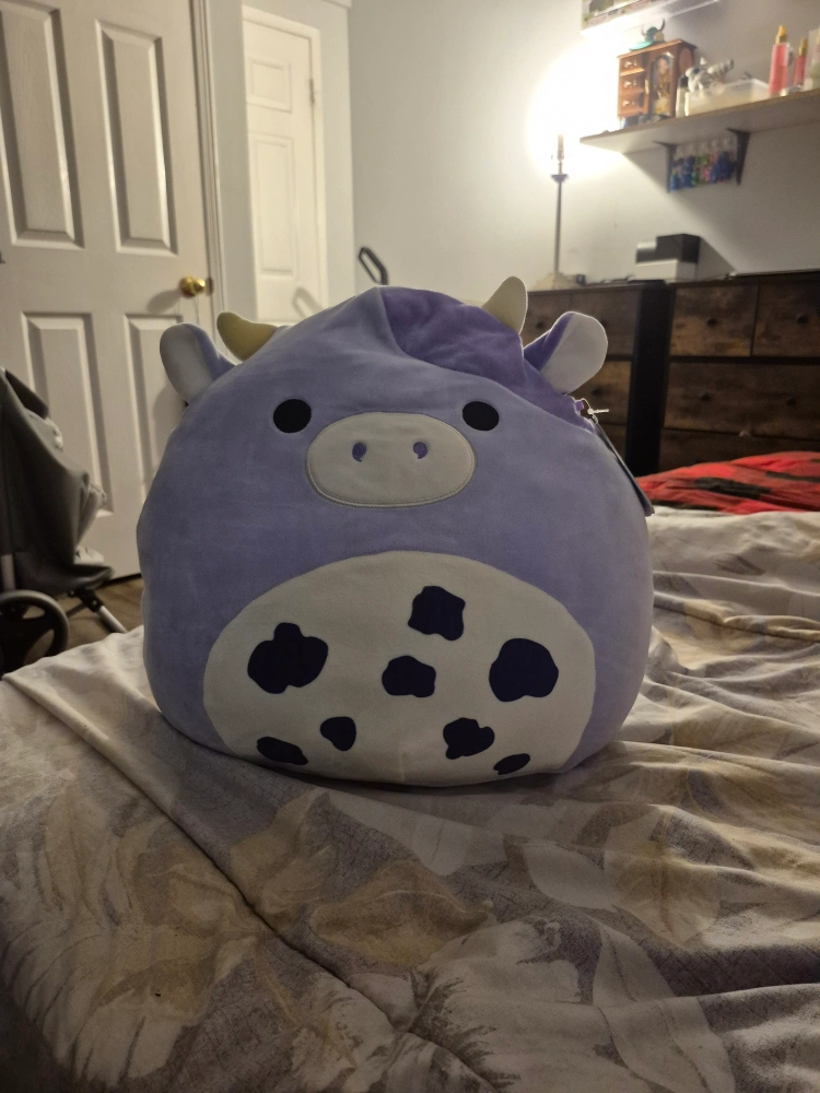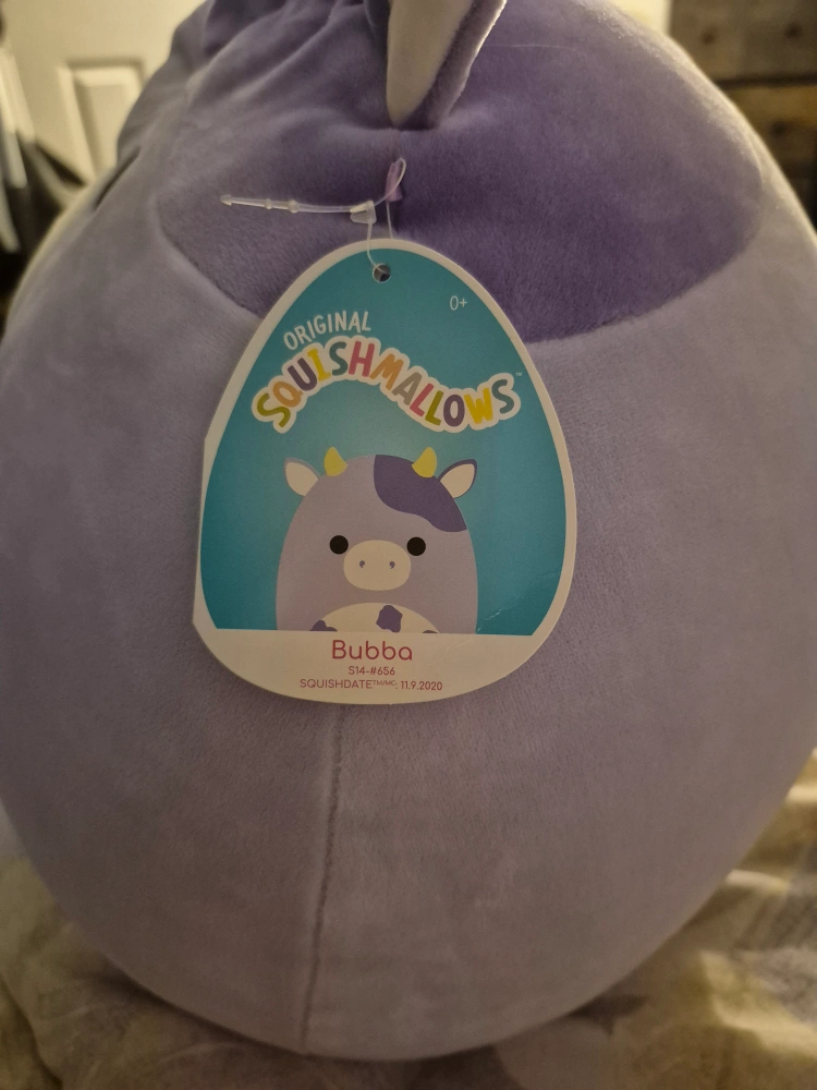 Selling a cute Squishmallows plush! It's Bubba the Cow. The tag says it's suitable for ages 0+. It's in great condition and ready for a new home