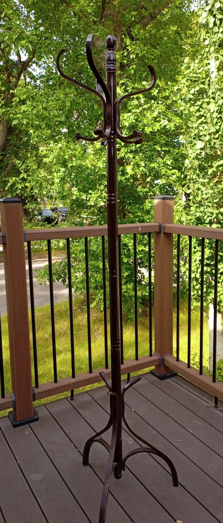 Dark brown, wooden coat rack, perfect for keeping your entryway organized! It features multiple hooks that rotate on base. One broken hook (see second photo) otherwise good condition.