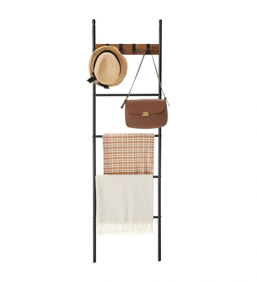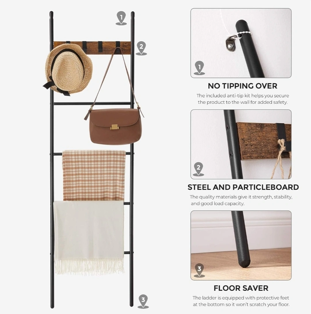 Vasagle 5-Tier Blanket Ladder with Hooks – Rustic Brown & Black