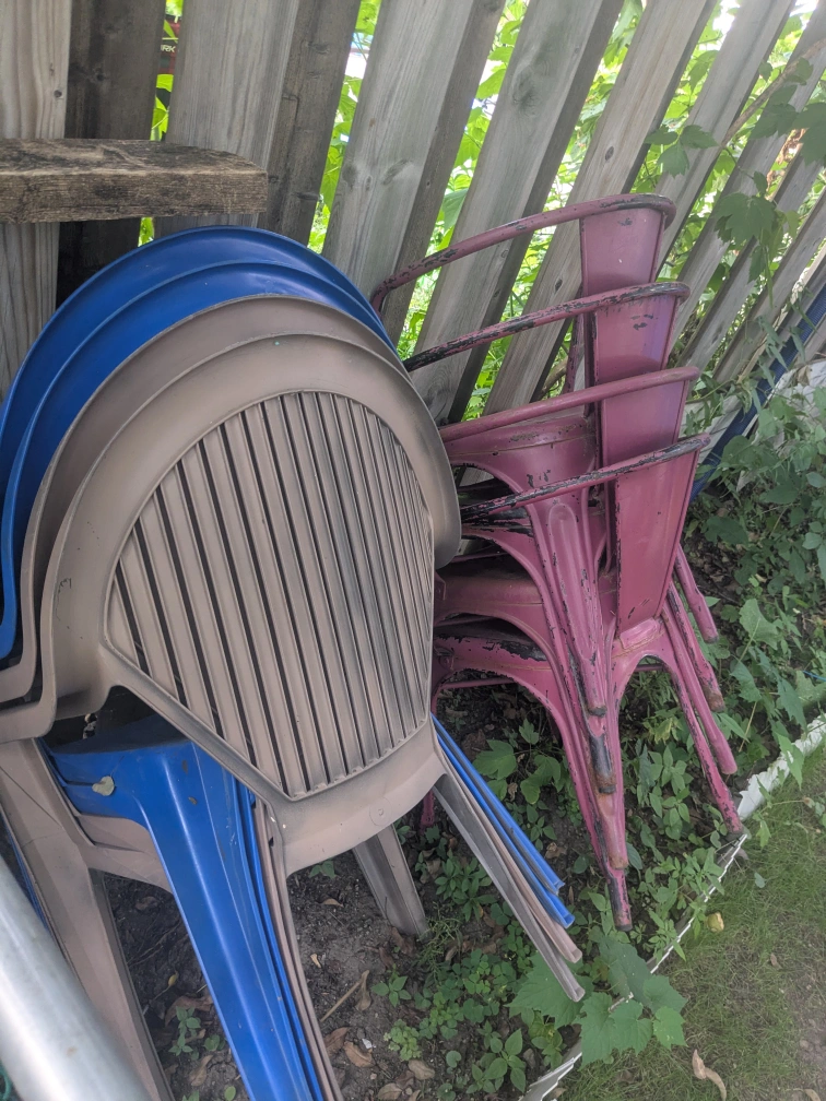 Selling a set of stackable outdoor chairs.