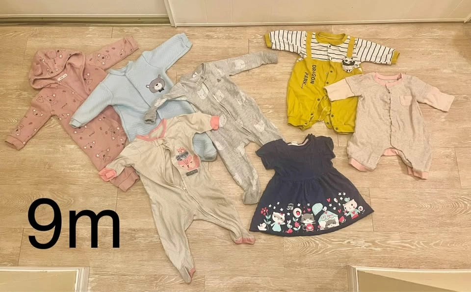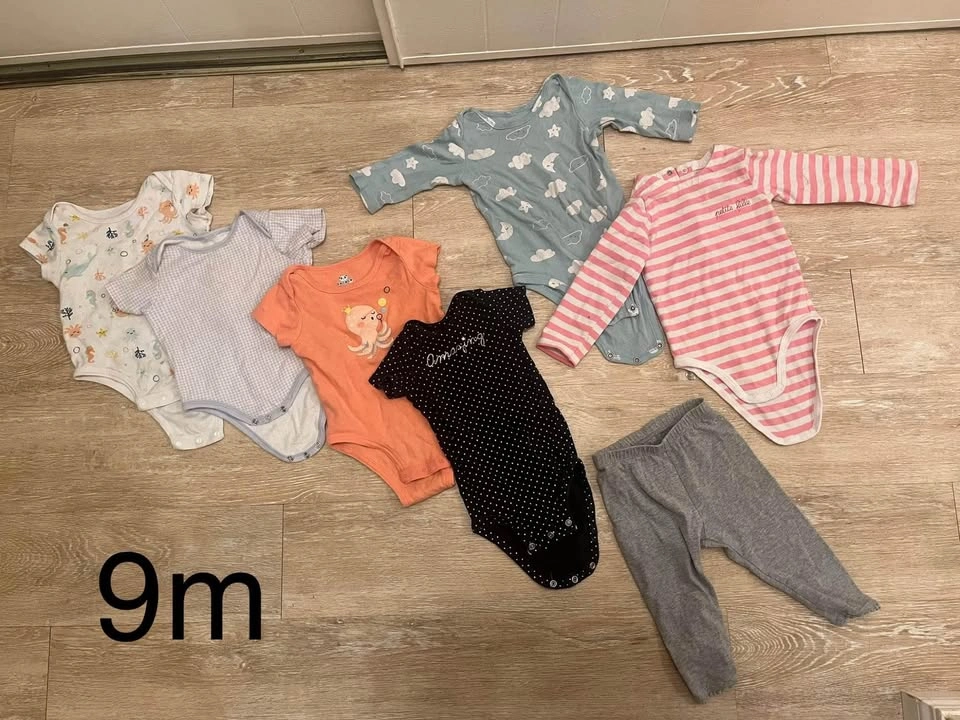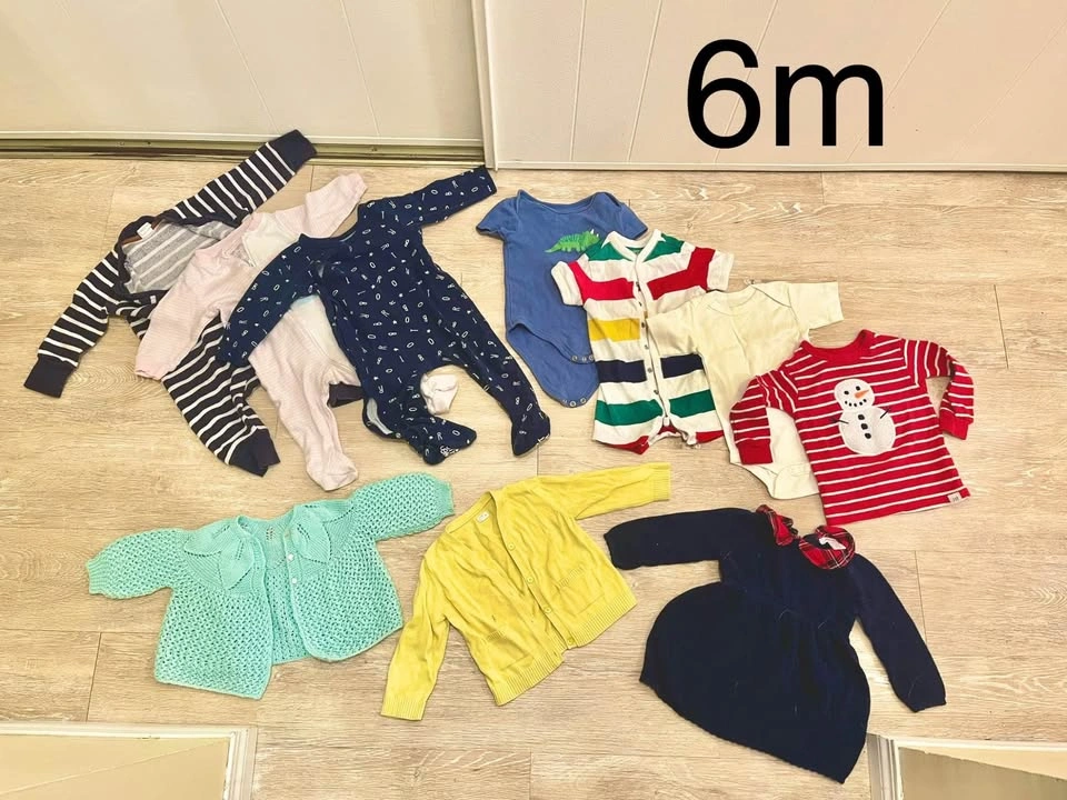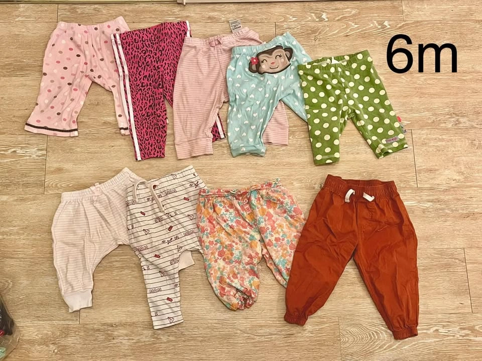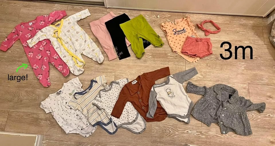 $15 per bag or $50 for all. Tried to sort sizes as accurately as I can. My daughter is 2 now so she’ll grow out of more things soon! Not sure why 6m pile has so many pants but baby clothes are always more flexible than their labels. Last photo/video: Odds and ends: A bag of bibs and a bag of socks, can be divided (first person gets first choices!) 3 hats Fabric with velcro for swaddling Thin muslin blanket (the yellow one) Frilly bib and matching blanket Lamb shaker toy, never used
