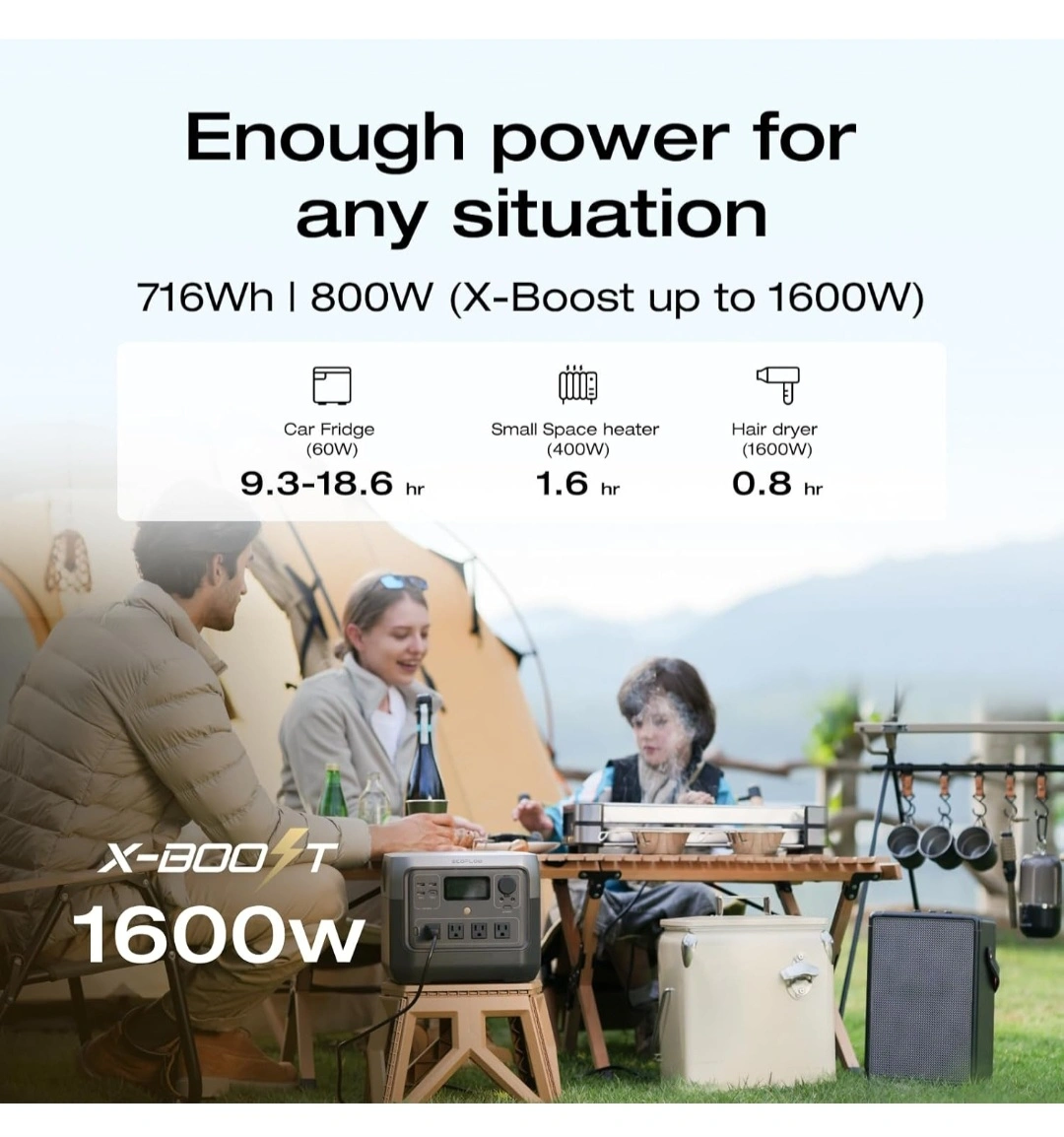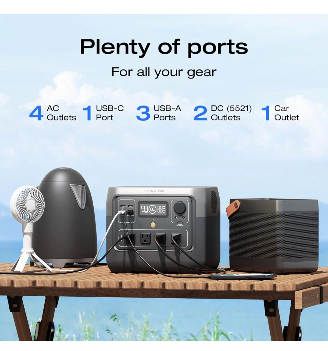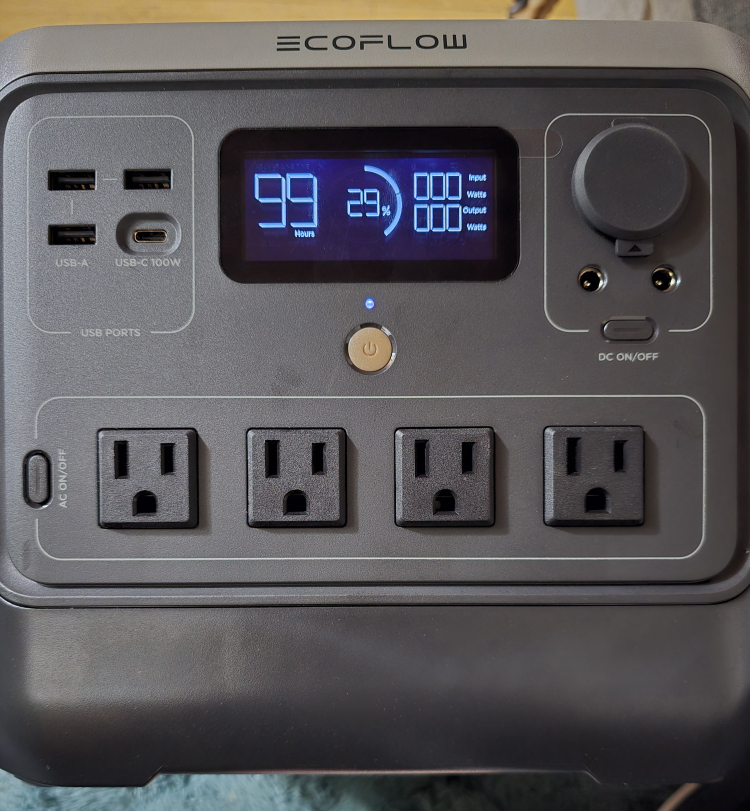 This EcoFlow River Pro portable power station has plenty of ports for all your gear! It has 4 AC outlets, 1 USB-C port, 3 USB-A ports, 2 DC (5521) outlets, and 1 car outlet. It provides enough space power for any situation with 716Wh and 800W (X-Boost up to 1600W)