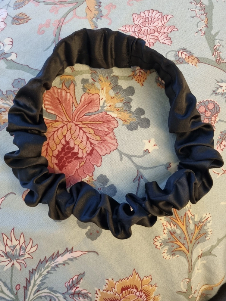 Here's a stylish black scrunchie headband! It's in great condition and ready to add a touch of flair to your look or even hold your hair back like during makeup or skincare. The front is more of a cute scrunchie vibe and the back side is more flat to provide support while you wear it.