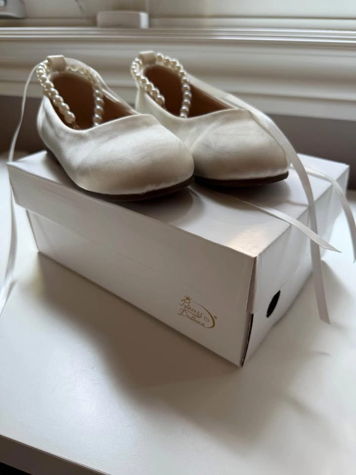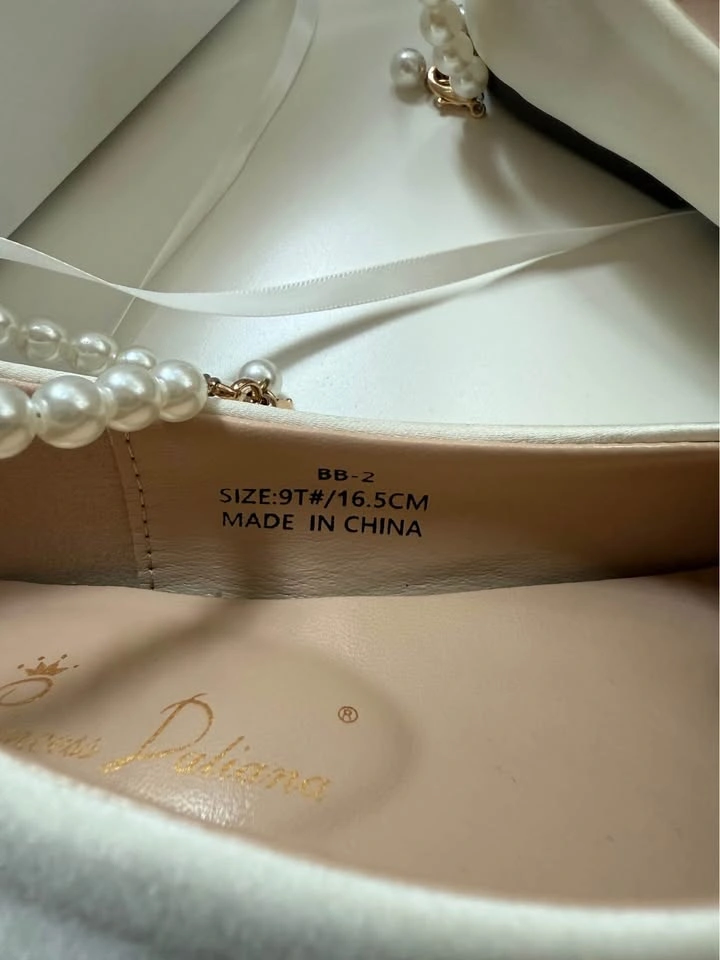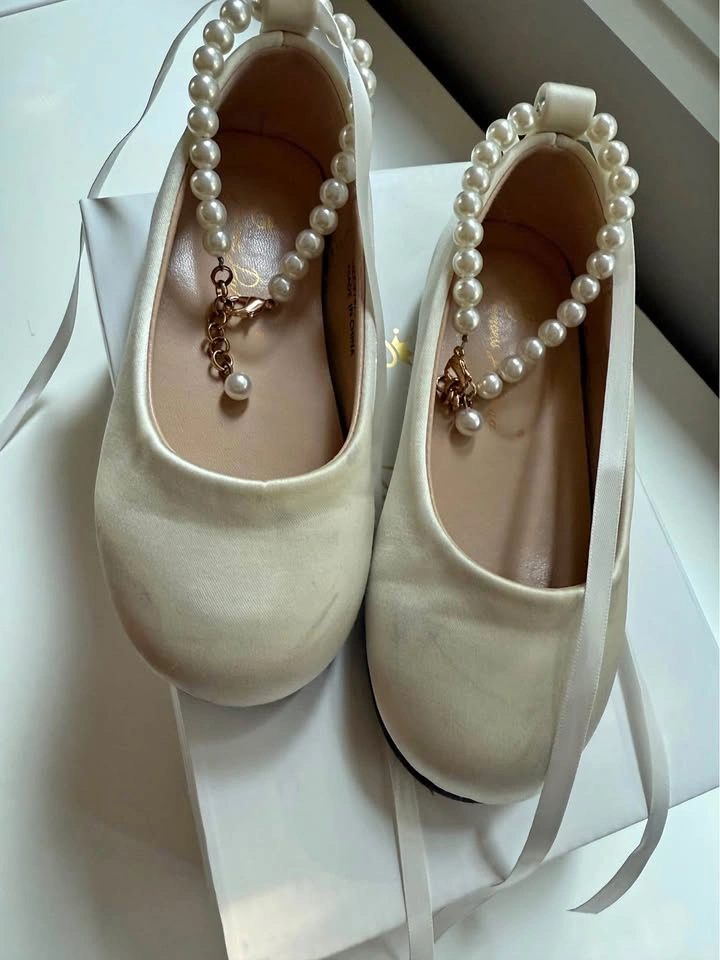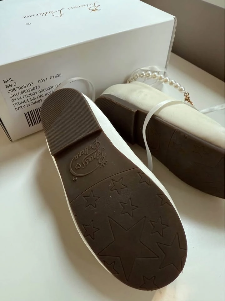 These archetypal ballet flats invite your little girl to play — and dress — the essential part in the big day. Cinched with satin top and a pearl loop and constructed with a silky finish, these shoes from Princess Daliana pair with any style dress. Satin, polyester Rubber sole Slip-on styling Bow embellishment Imported Uses, mild scuffs as depicted Size 9T/16.5 cm