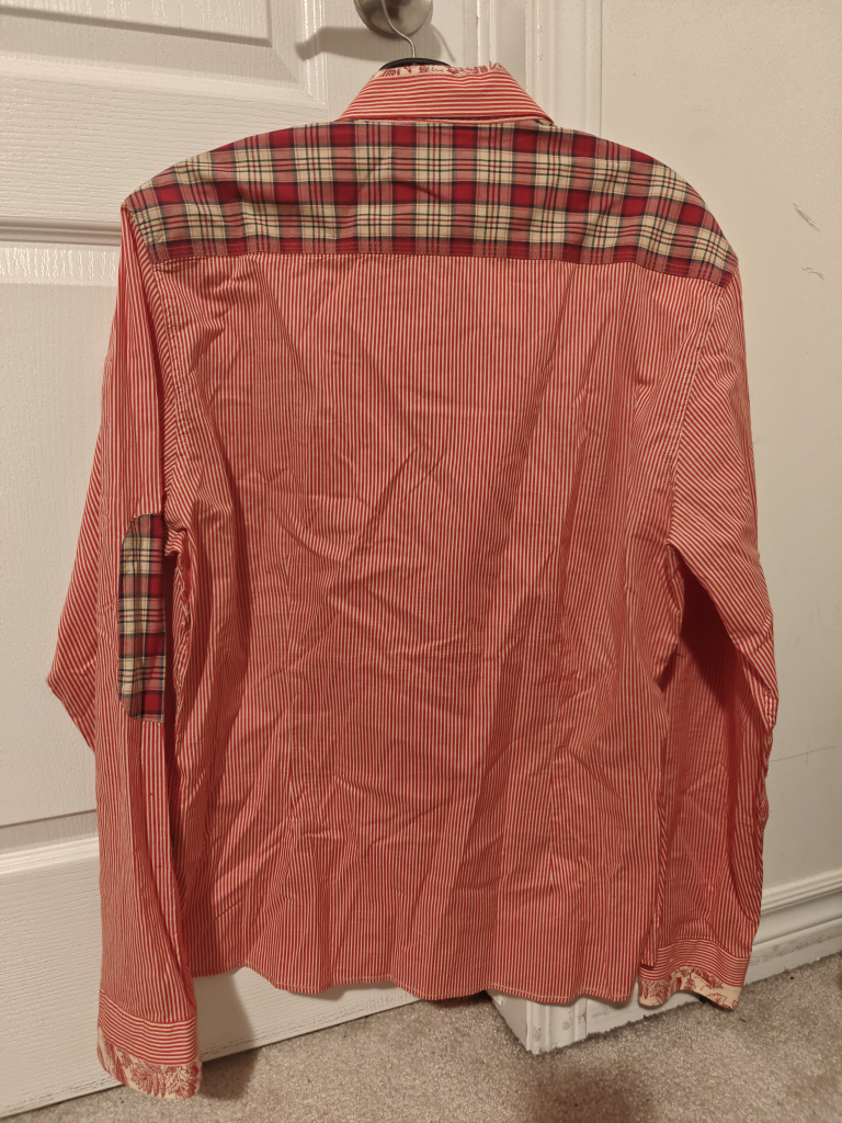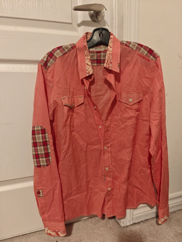 This Lemon Tree button-down shirt features a unique design with red stripes and plaid accents. It's in great condition and ready for a new home! The shirt has a classic button-down style, perfect for casual or semi-formal occasions. The material feels comfortable and breathable, making it suitable for all-day wear