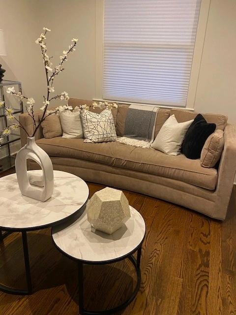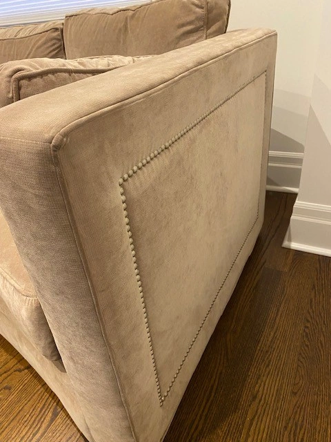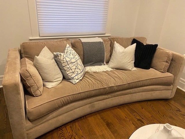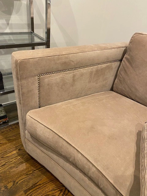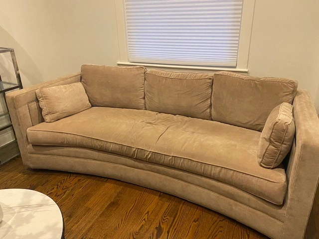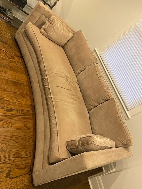 116Elegant Upholstered Sofa – Deep Seat, Nailhead Detail – Elte – $200 Beautiful, high-quality sofa from Elte, fully upholstered with a curved seat and classic nailhead trim. Designed for both style and comfort, with a deep seat and supportive cushions. Details: One long bottom cushion Three back cushions + two side/arm pillows Elegant nailhead detail along the edges 87" L x 45" D x 29" H Decorative throw pillows and blanket not included From a non-smoking home Originally purchased from Elte – known for timeless, designer-quality furniture. Great for a living room or lounge space. Message if you’re interested or have any questions!