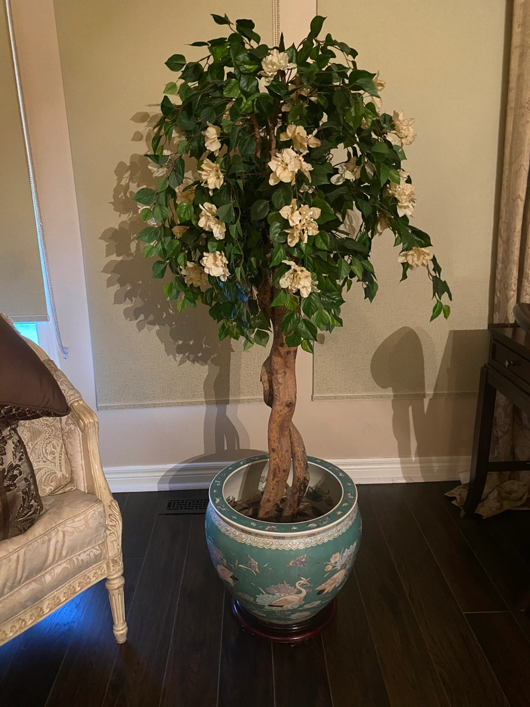 22Here's a lovely artificial tree in a decorative pot! It adds a touch of greenery to any room without the need for watering or maintenance. The pot has a beautiful design featuring birds and flowers. It's a great way to brighten up your space
