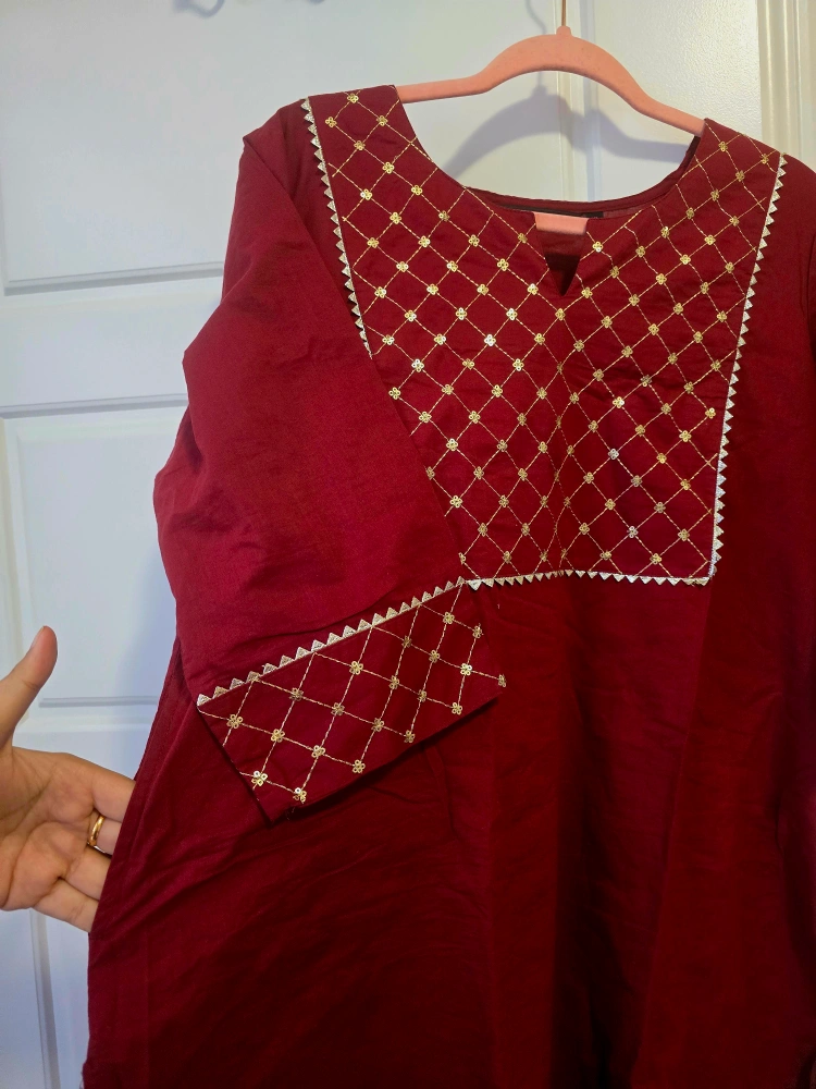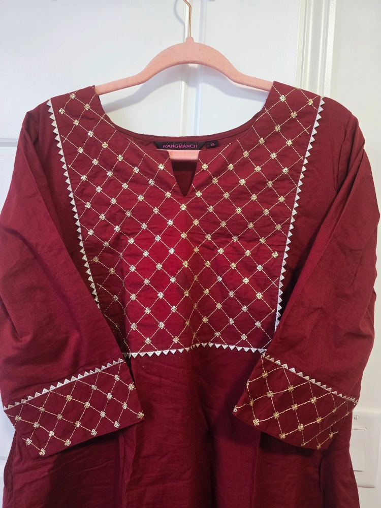 I'm selling a maroon Rangmanch kurti. it features gold embroidery on the neckline and sleeves. It's in new condition and ready for a new home