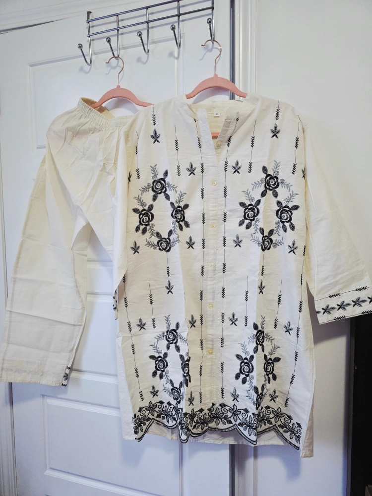 Selling a lovely kurta pajama set, perfect for a relaxed yet stylish look! The set features delicate embroidery with floral designs, adding a touch of elegance. It's a comfortable and breathable outfit, great for everyday wear or special occasions. The material feels soft and light, ideal for warmer weather. This set includes both the kurta (top) and the pajama (bottom).
