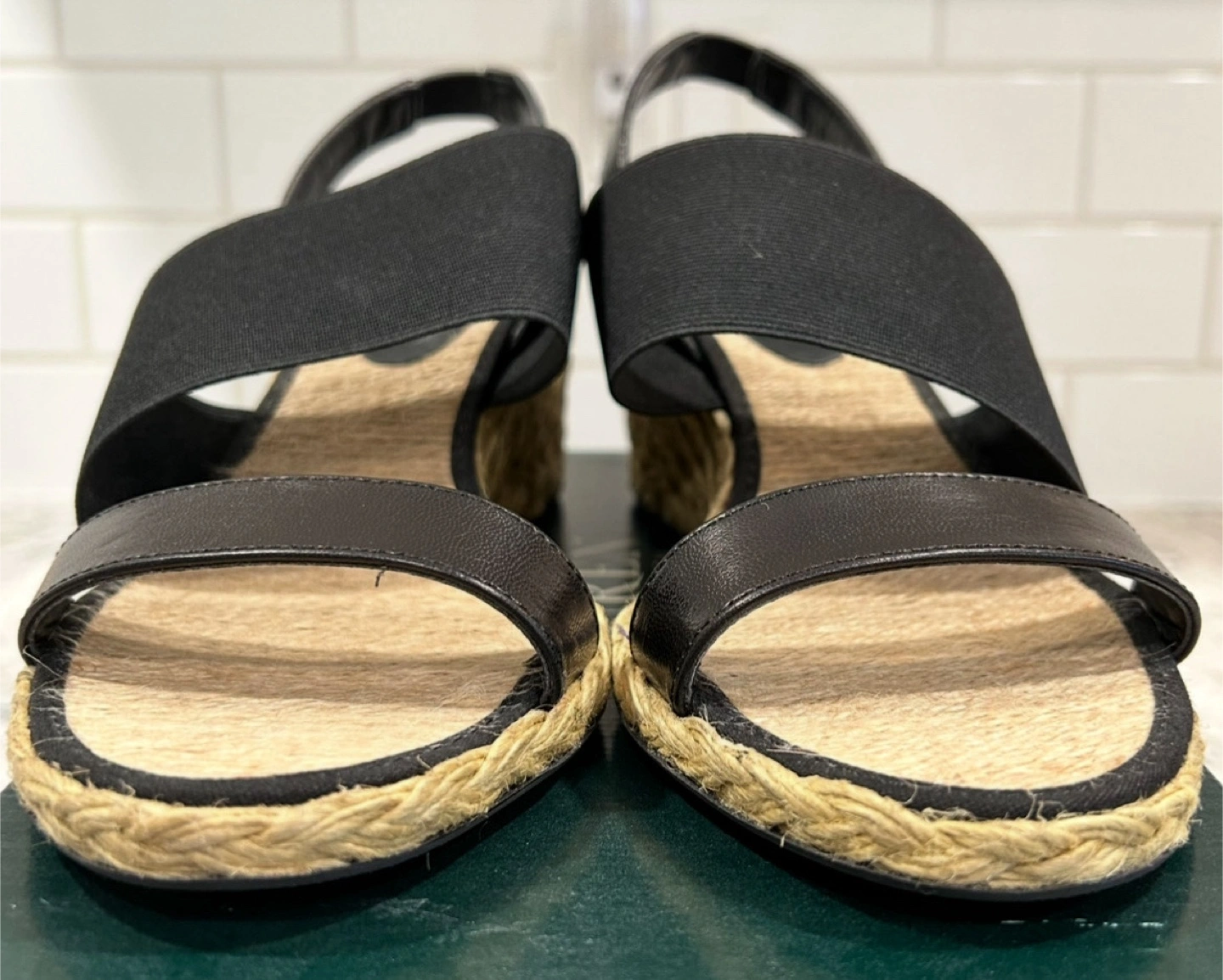 These stylish wedges feature a comfortable elastic strap and a classic espadrille sole, perfect for adding a touch of elegance to any summer outfit