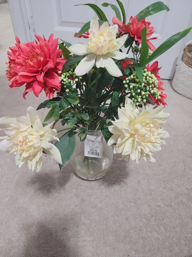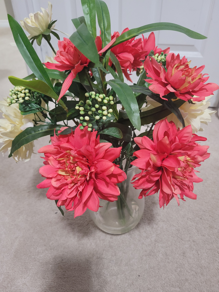 A lovely floral arrangement in a glass vase. It features a mix of red and cream-coloured flowers with greenery. Perfect for adding a touch of colour to any room!