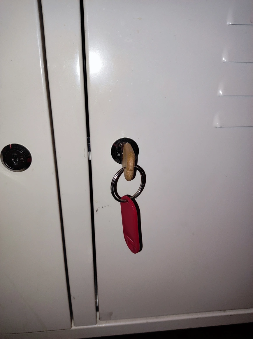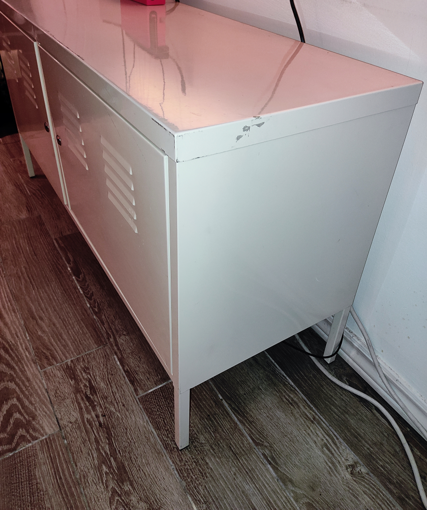 Here's a white metal cabinet with a locker-style design. It has some signs of wear, as shown in the photos. The cabinet includes keys to lock the doors. It's a great piece for adding some storage and a unique look to your space