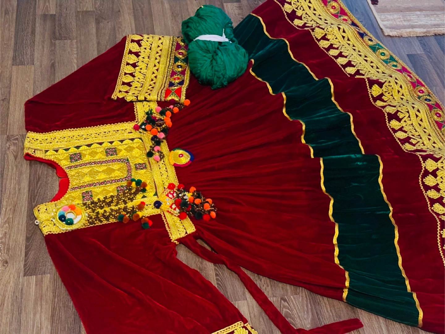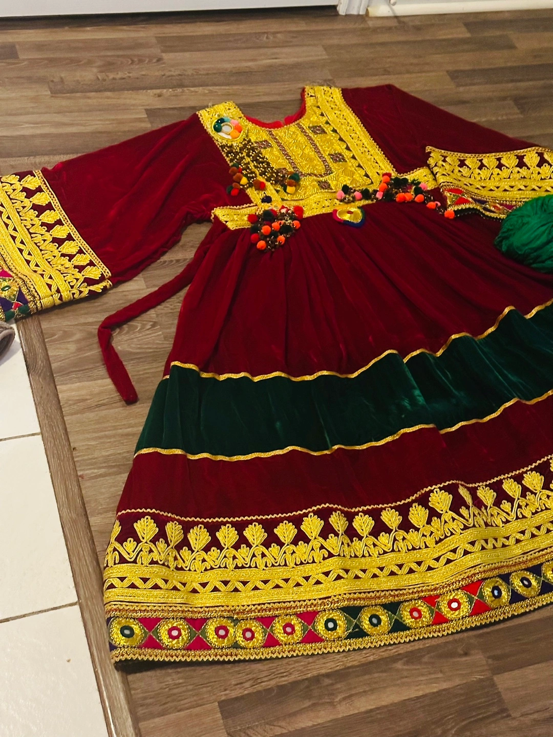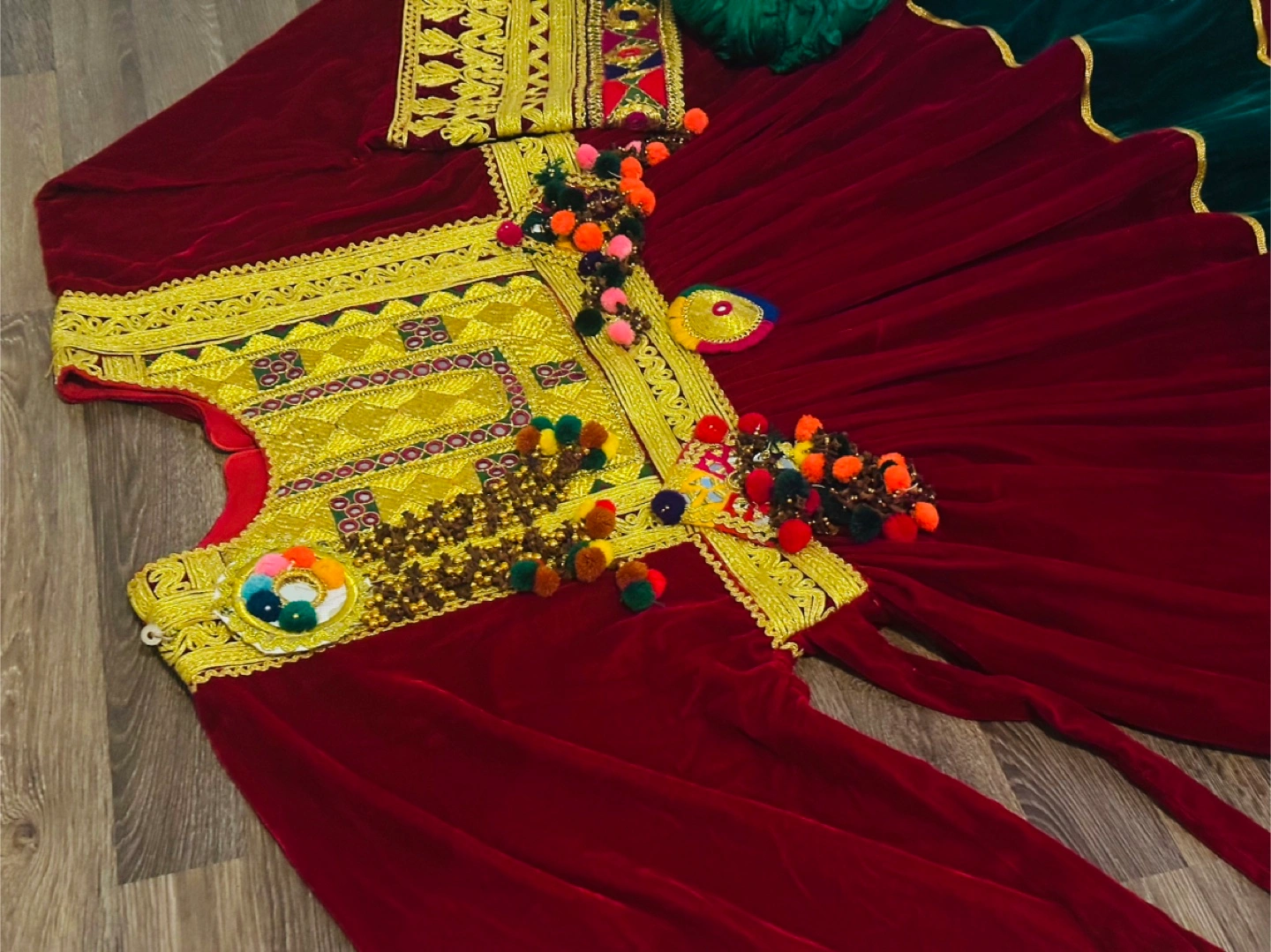 73Beautiful traditional Afghan dress in a rich red velvet with gold embroidery and colourful embellishments. Perfect for special occasions or cultural events. The dress features intricate detailing and a flowing design.